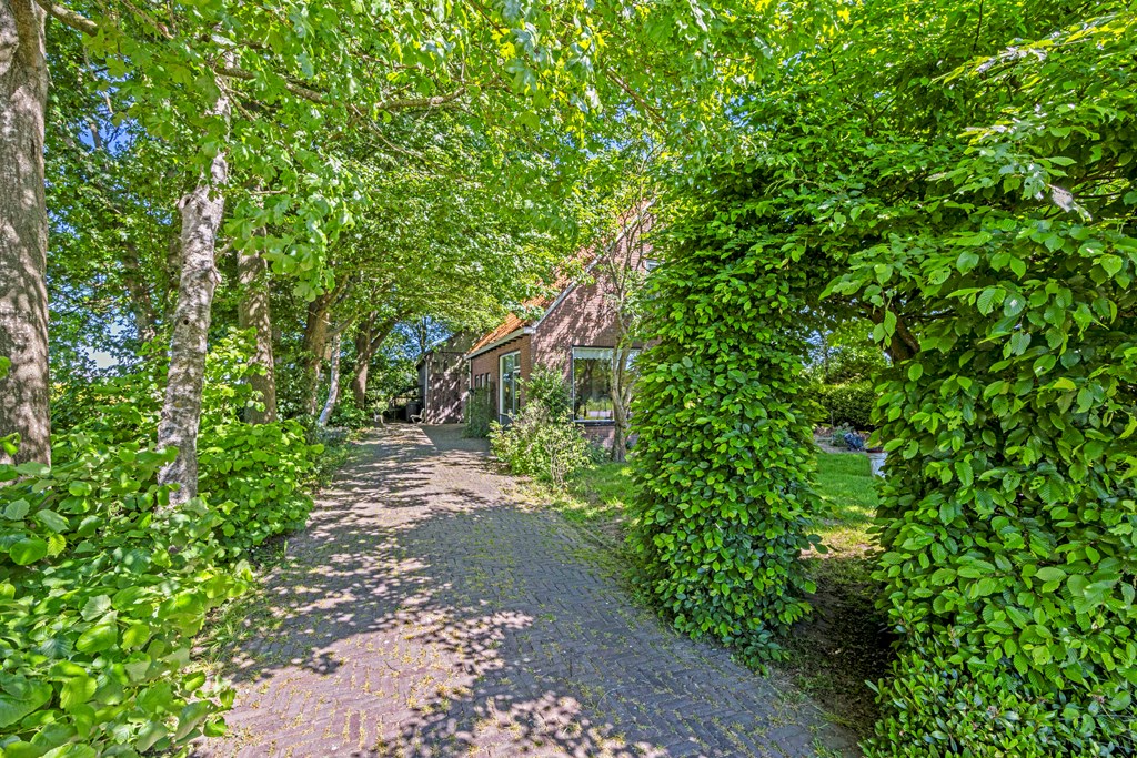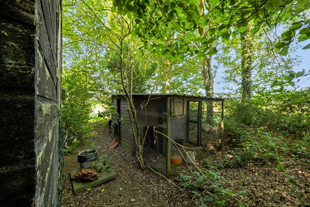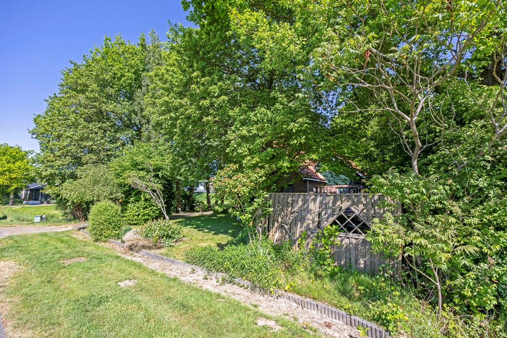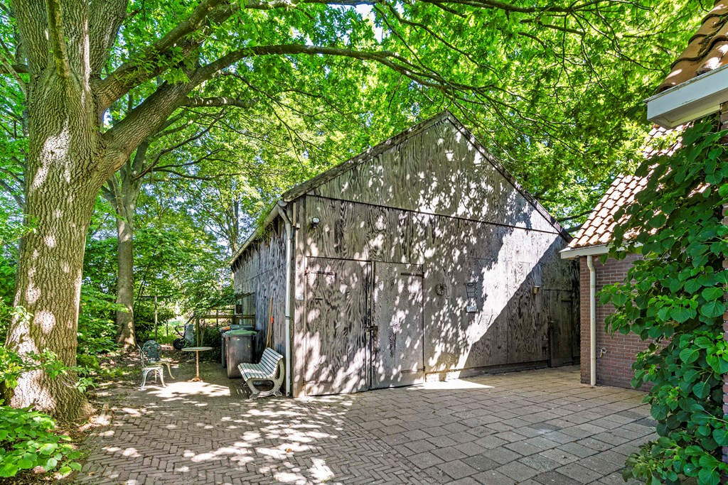 De tuin beschikt over veel bomen, diverse terrassen, oprit met parkeergelegenheid en een houten schuur met openslaande deuren en een vliering.