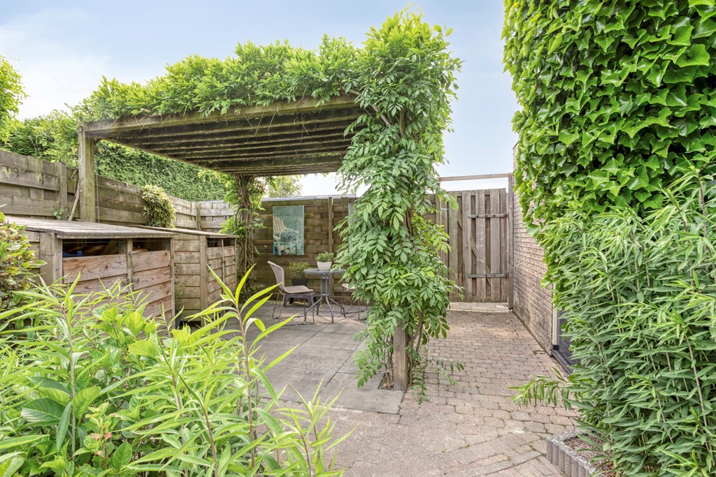 De achtertuin is gelegen op het zuidwesten en voorzien van veel groen, een terras, berging, overdekt terras en een achterom.
