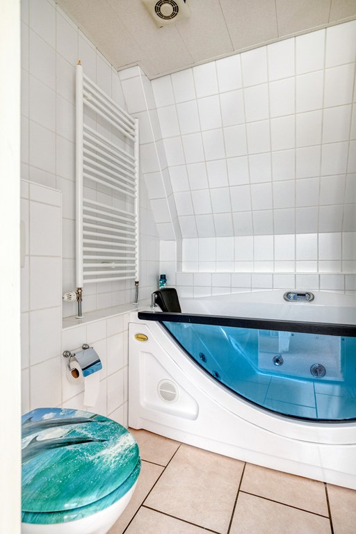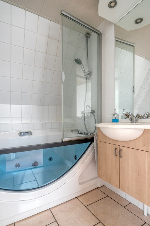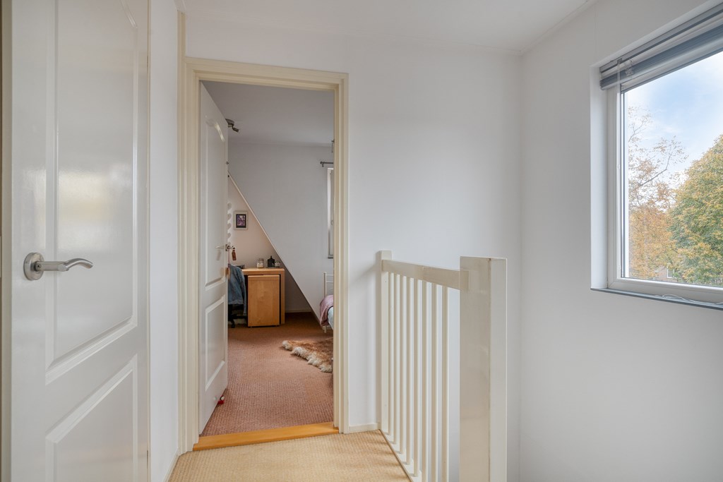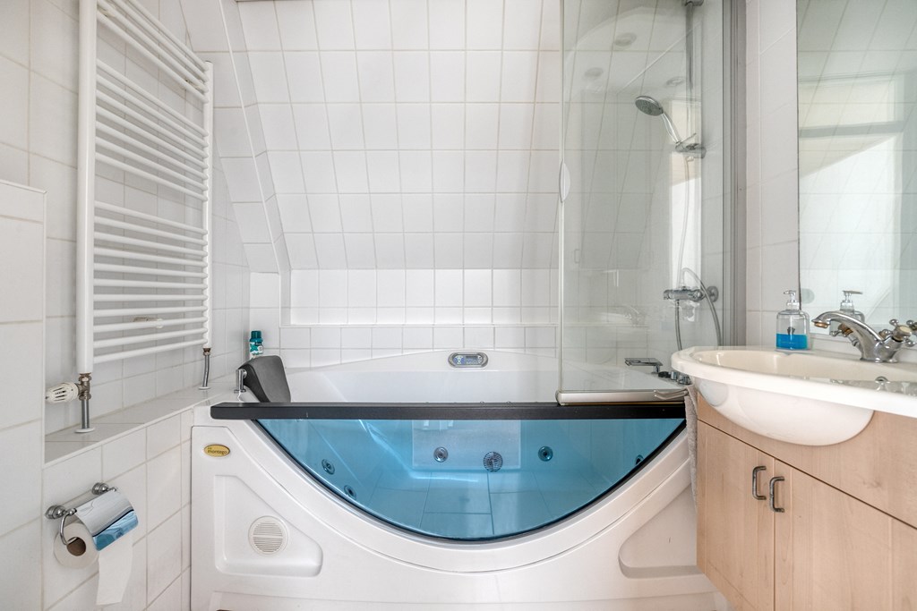 Overloop met trapopgang en 3 slaapkamers. De badkamer is voorzien van een toilet, wastafel in meubel en een ligbad met douche. Via de grootste slaapkamer bereikt u het grote dakterras.