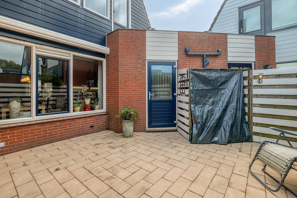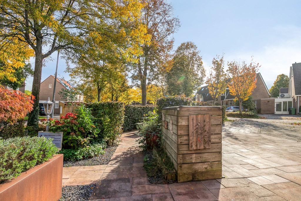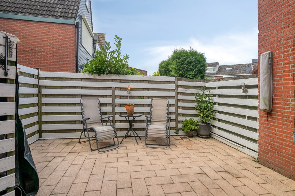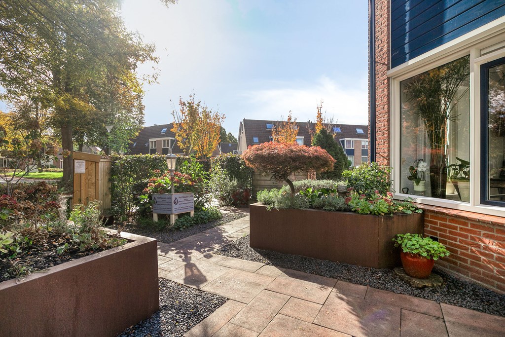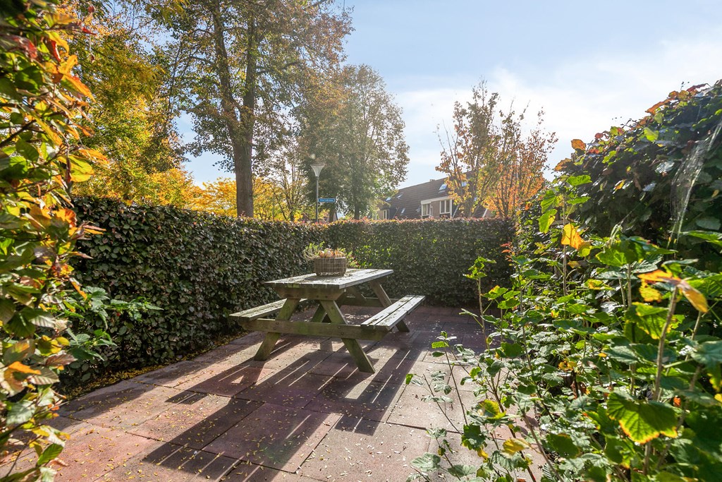 Achter de woning is een beschut terras. De brede voortuin is gelegen op het zuidoosten en voorzien van veel groen, terras en een oprit.