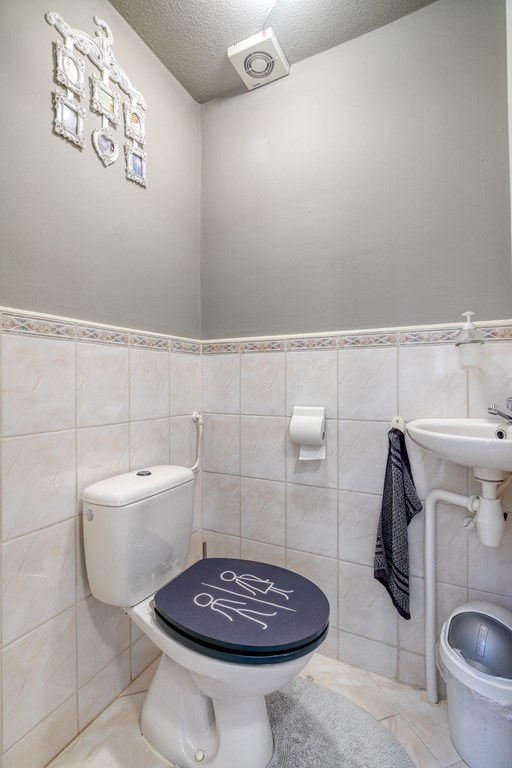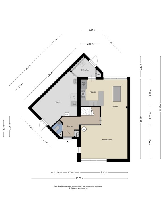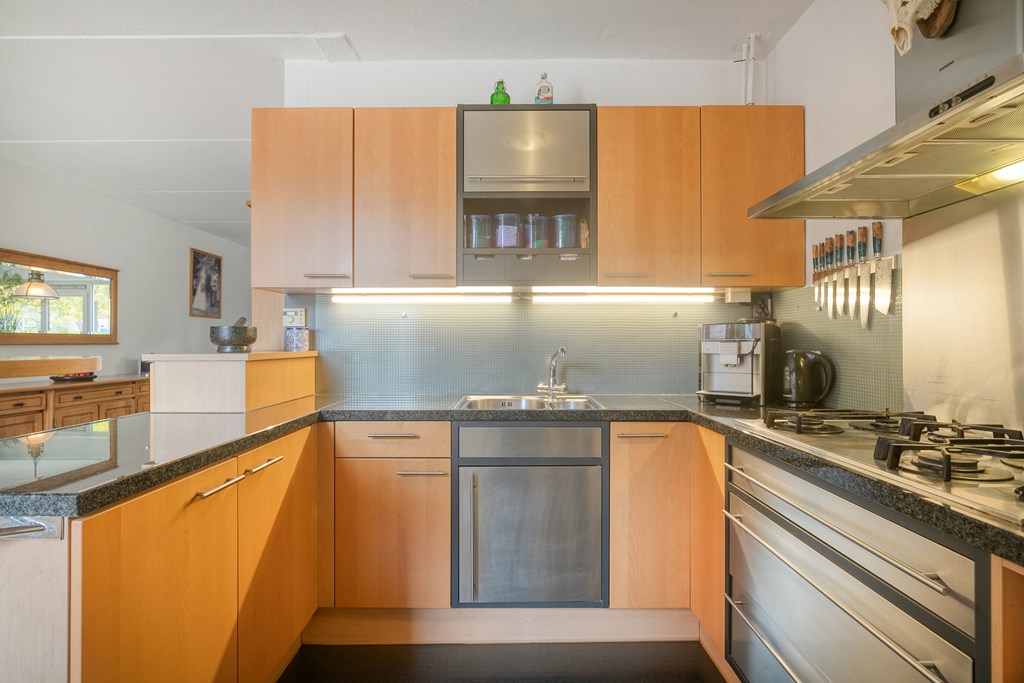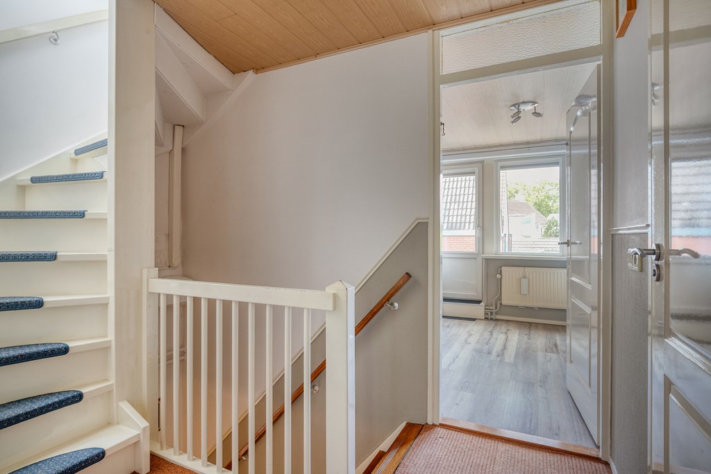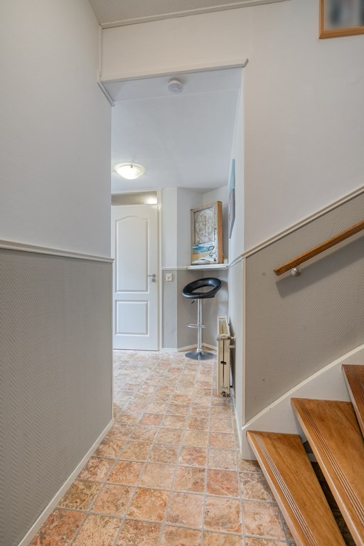 Entree/hal met meterkast, trapopgang en een toilet. De woonkamer beschikt over veel lichtinval, een houtkachel (ter overname) en de keukenopstelling met diverse inbouwapparatuur, o.a. gaskookplaat en een afzuigkap. Via de bijkeuken bereikt u de achtertuin en de garage.