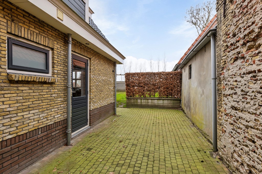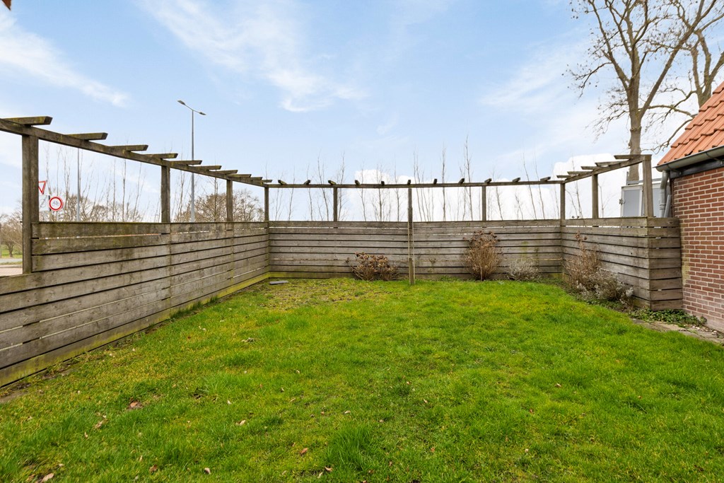 De achtertuin is gelegen op het westen en voorzien van o.a. een terras en parkeergelegenheid voor meerdere auto’s.
