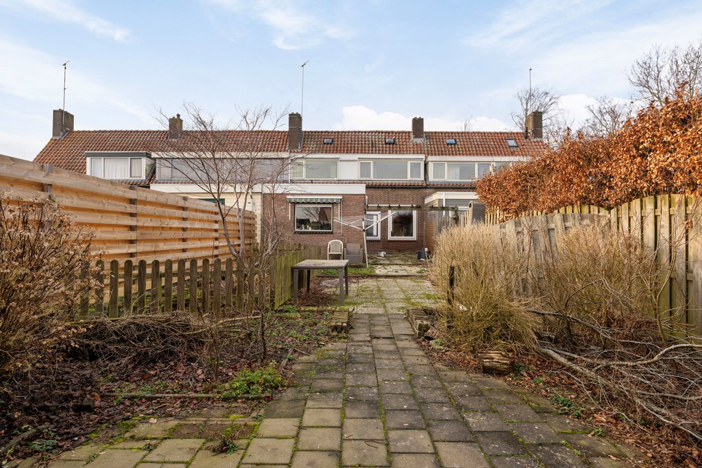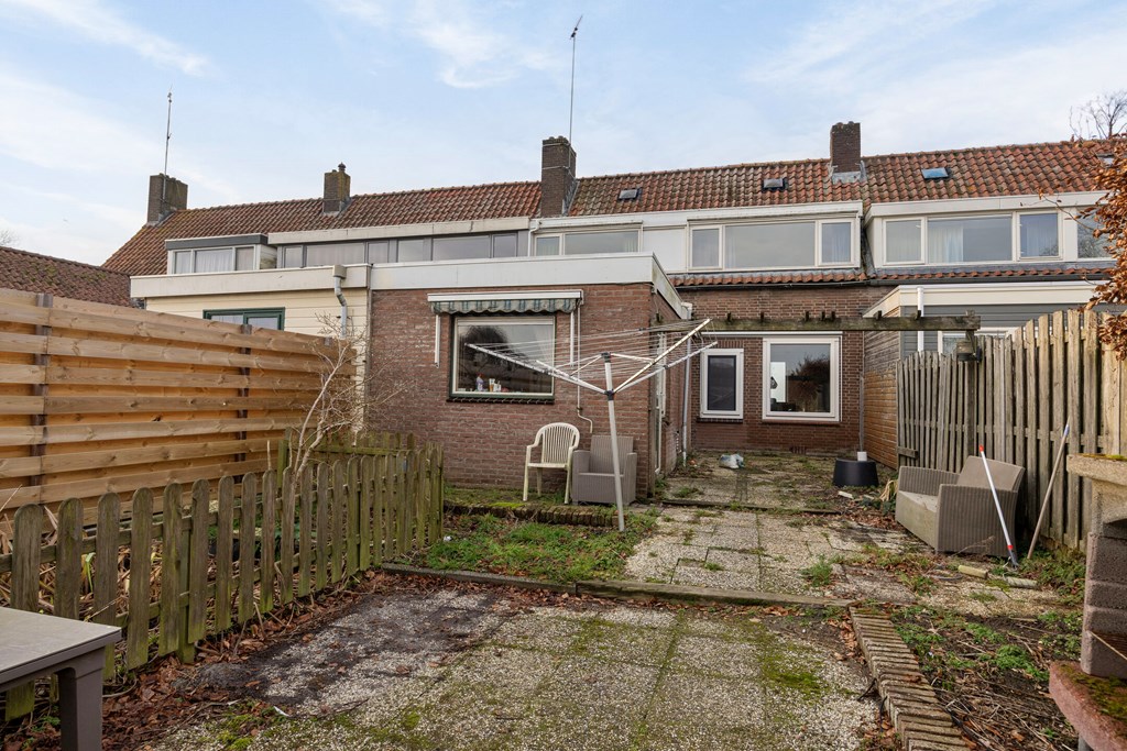 - De tussenwoning beschikt over een diepe achtertuin met diverse terrassen en een achterom.