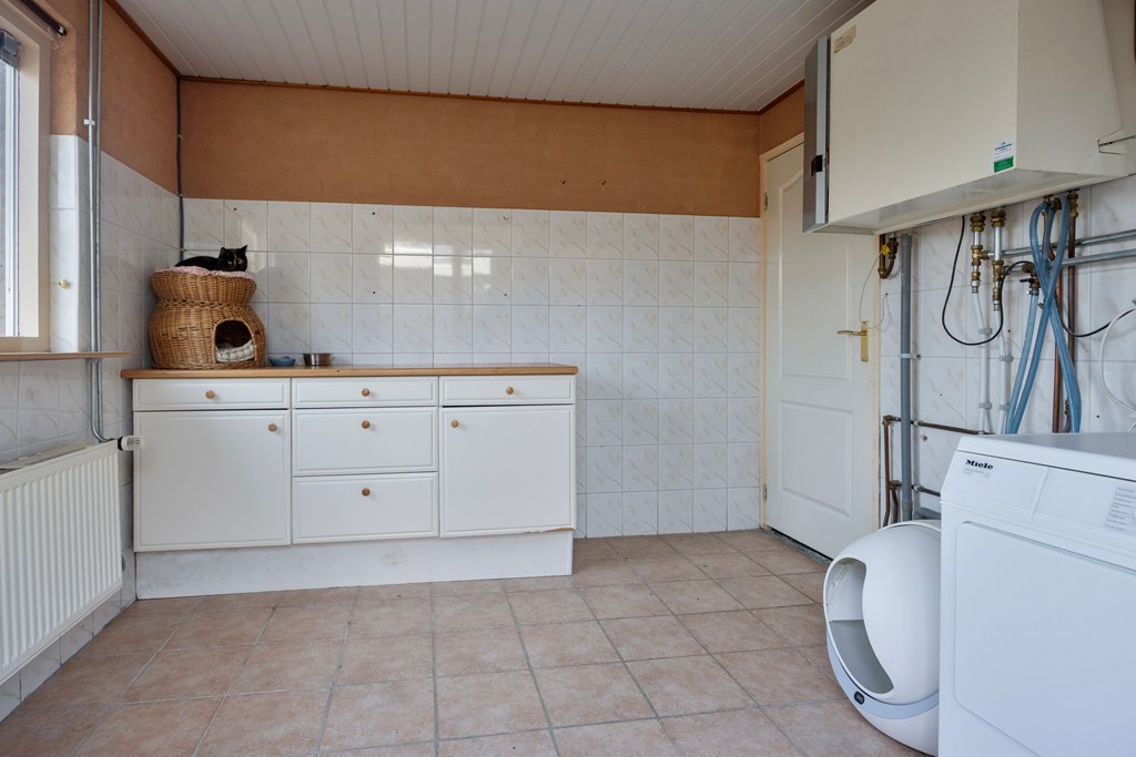 Entree / keuken met meterkast, kelder en een keukenblok voorzien van diverse inbouwapparatuur, o.a. inductiekookplaat, afzuigkap, koelkast, vrieskast en 2 vaatwasmachines. De lichte woonkamer beschikt over uitzicht op de voor- en achtertuin. Via de keuken bereikt u een hal met het toilet, trapopgang, tuindeur, bijkeuken en de badkamer voorzien een ligbad, douche en een wastafel in meubel.