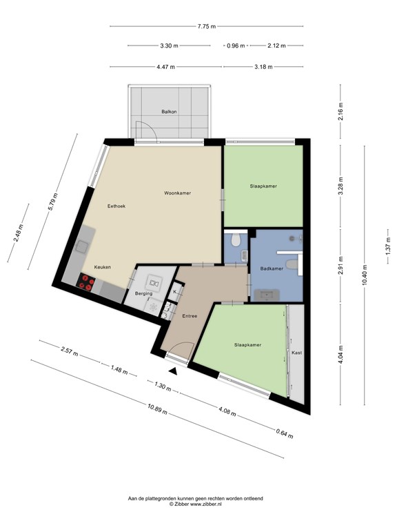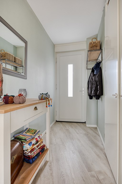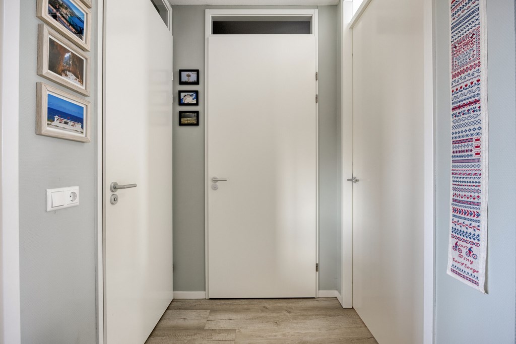 Entree / hal met meterkast, slaapkamer, toilet en de badkamer voorzien van douchehoek, toilet en een wastafel. De woonkamer beschikt over veel lichtinval, balkondeur en een modern keukenblok met diverse inbouwapparatuur o.a. inductiekookplaat, afzuigkap, oven, vaatwasmachine en een koelkast. Via de woonkamer bereikt u ook de tweede slaapkamer en een berging.
