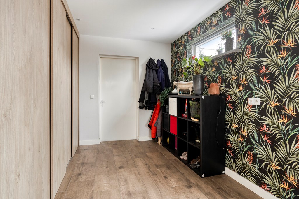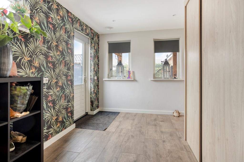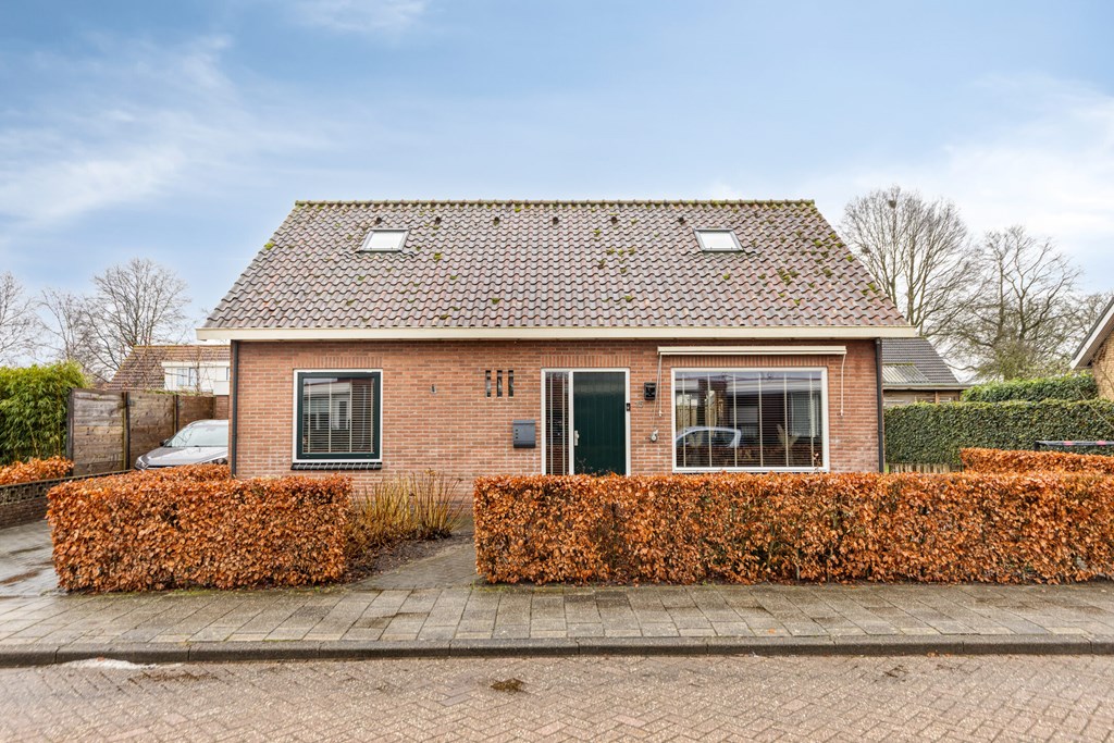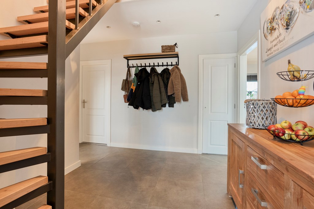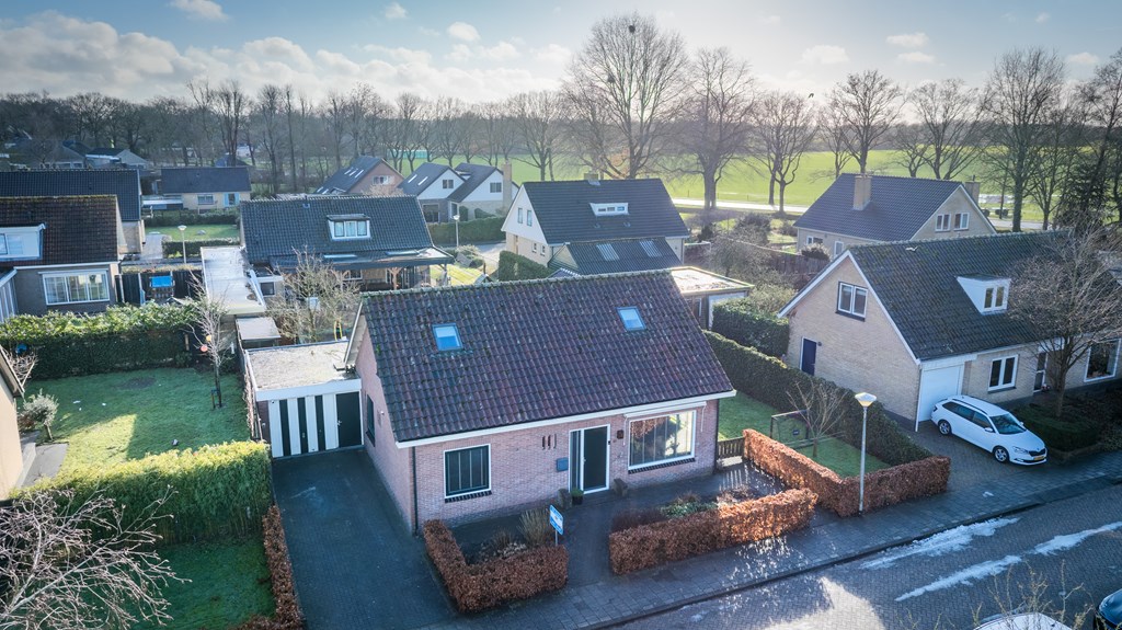 Entree/hal met trapopgang, meterkast en toilet. De woonkamer is voorzien van openslaande tuindeuren naar het overdekte terras, veel lichtinval en de keukenopstelling met diverse inbouwapparatuur, o.a. een koelkast, inductiekookplaat, afzuigkap, oven en een vaatwasser. De bijkeuken, bereikbaar vanuit de keuken, heeft een toegang naar de tuin en de garage. Via de hal bereikt u 2 slaapkamers en de badkamer voorzien van een douche en een wastafel in meubel.