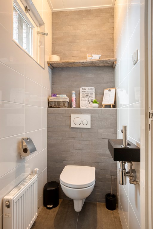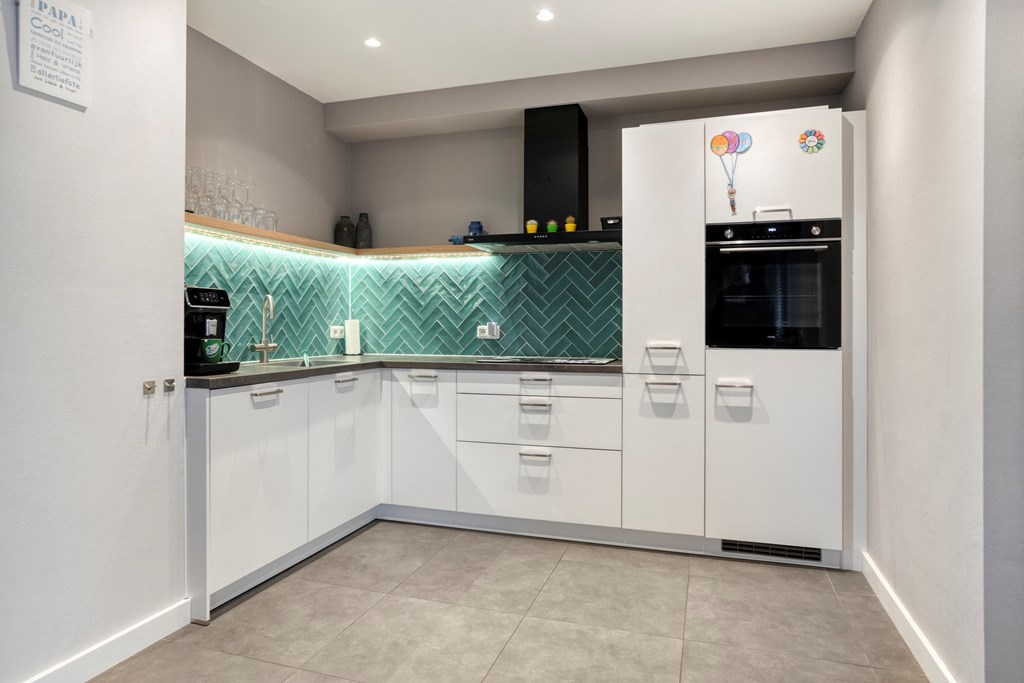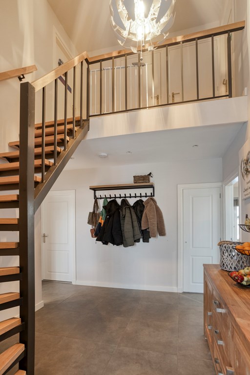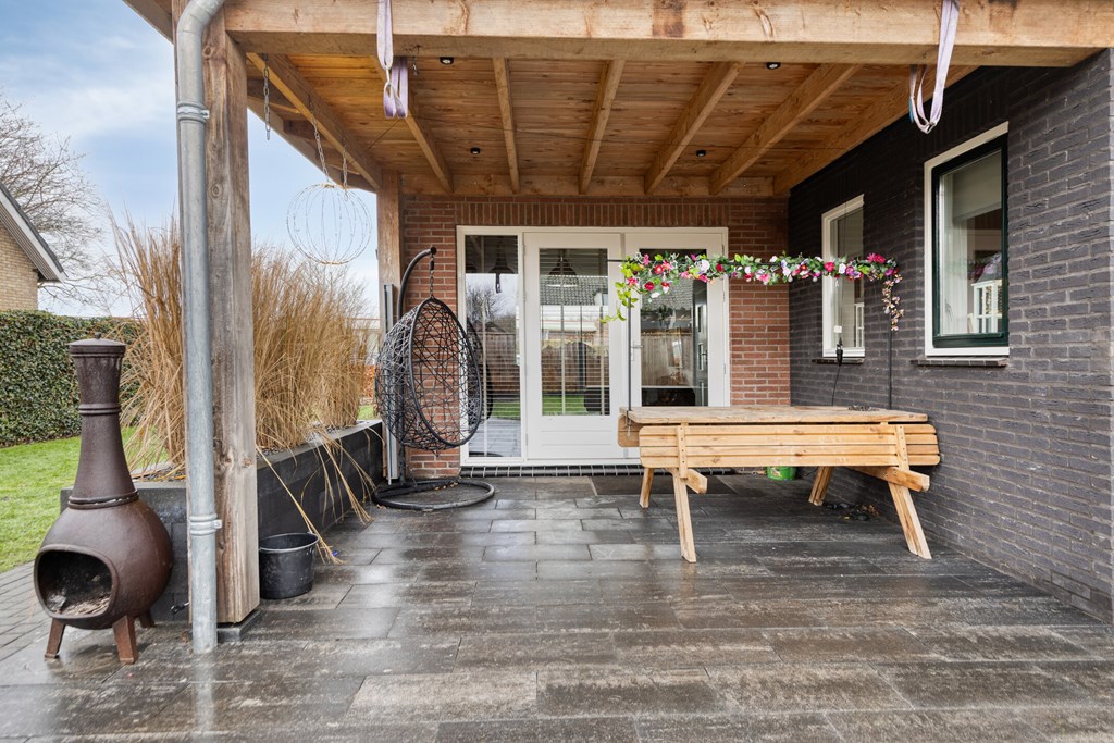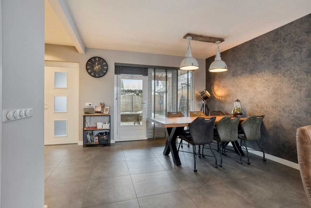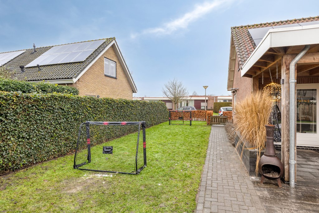 Entree/hal met trapopgang, meterkast en toilet. De woonkamer is voorzien van openslaande tuindeuren naar het overdekte terras, veel lichtinval en de keukenopstelling met diverse inbouwapparatuur, o.a. een koelkast, inductiekookplaat, afzuigkap, oven en een vaatwasser. De bijkeuken, bereikbaar vanuit de keuken, heeft een toegang naar de tuin en de garage. Via de hal bereikt u 2 slaapkamers en de badkamer voorzien van een douche en een wastafel in meubel.