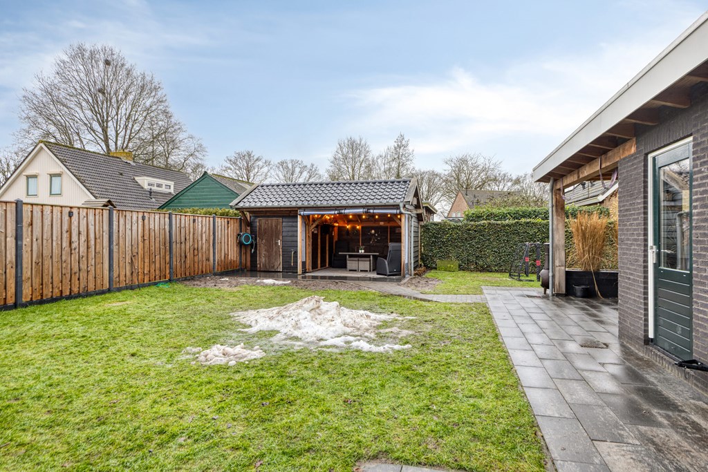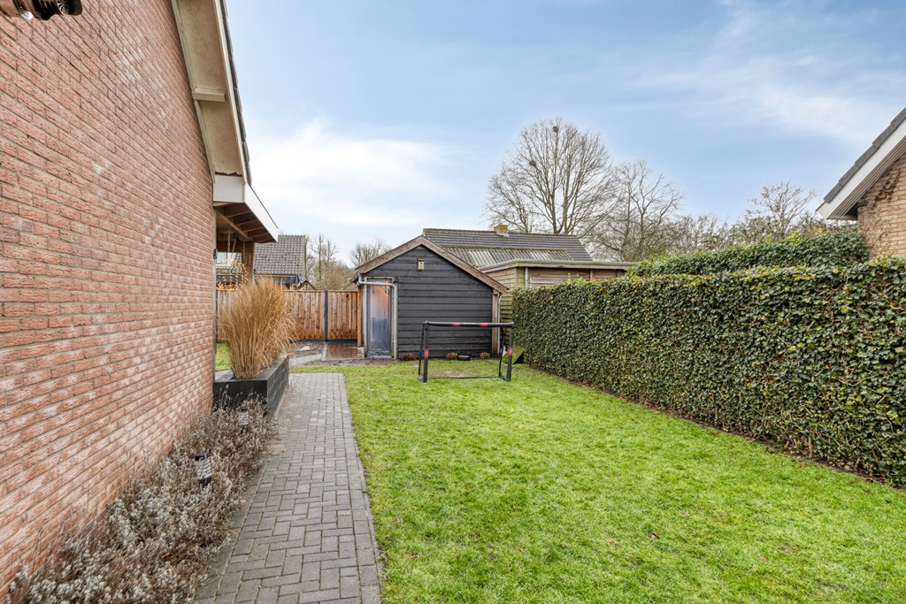 De tuin is gelegen rondom de semibungalow en voorzien van een overdekt terras, o.a. bereikbaar via de woonkamer en een houten berging met een overkapping. Voor de garage is een oprit met parkeergelegenheid.