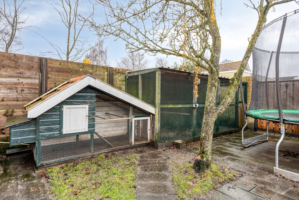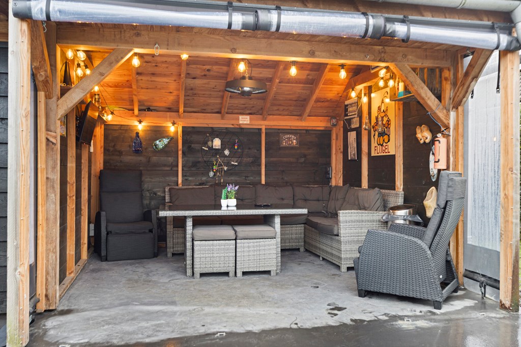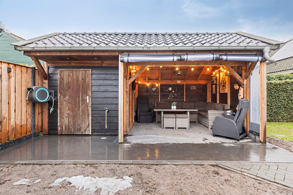- De semibungalow is voorzien van een tuin met 2 overdekte terrassen en een berging.