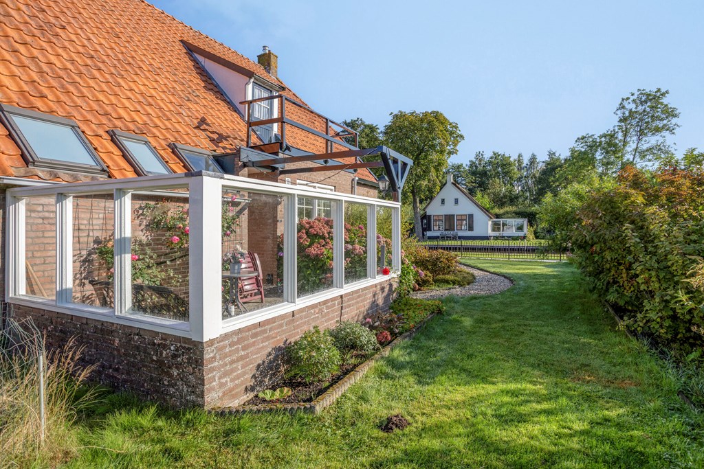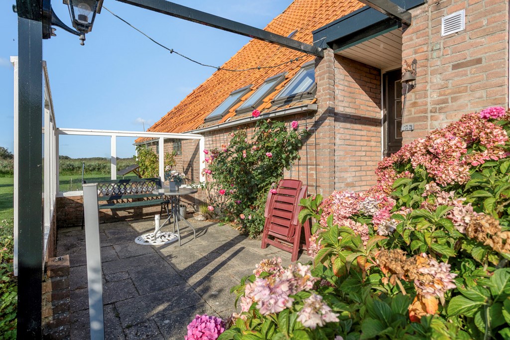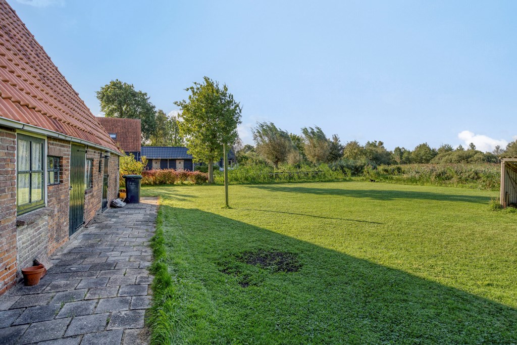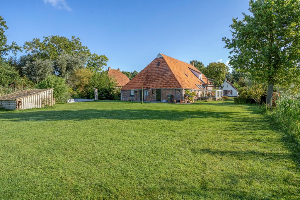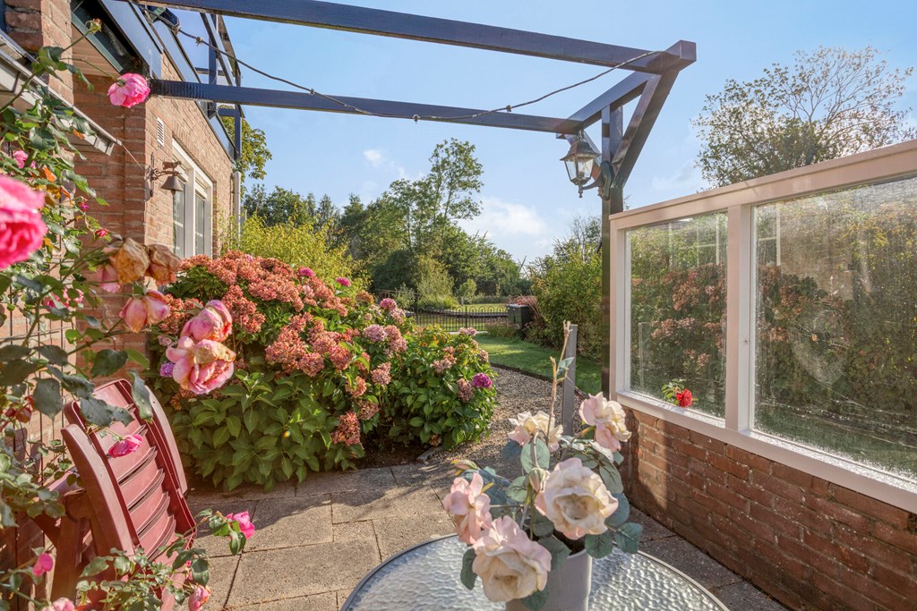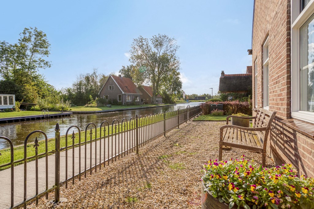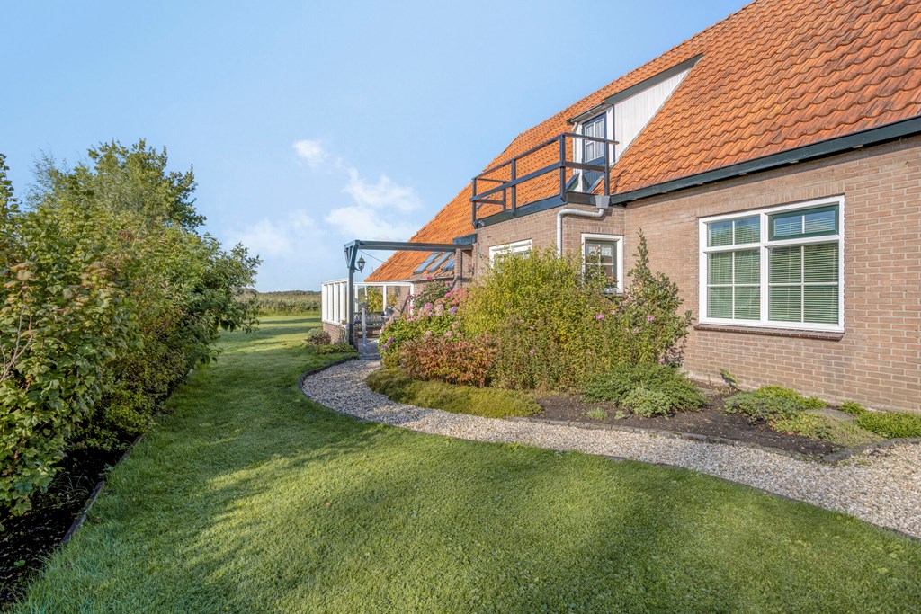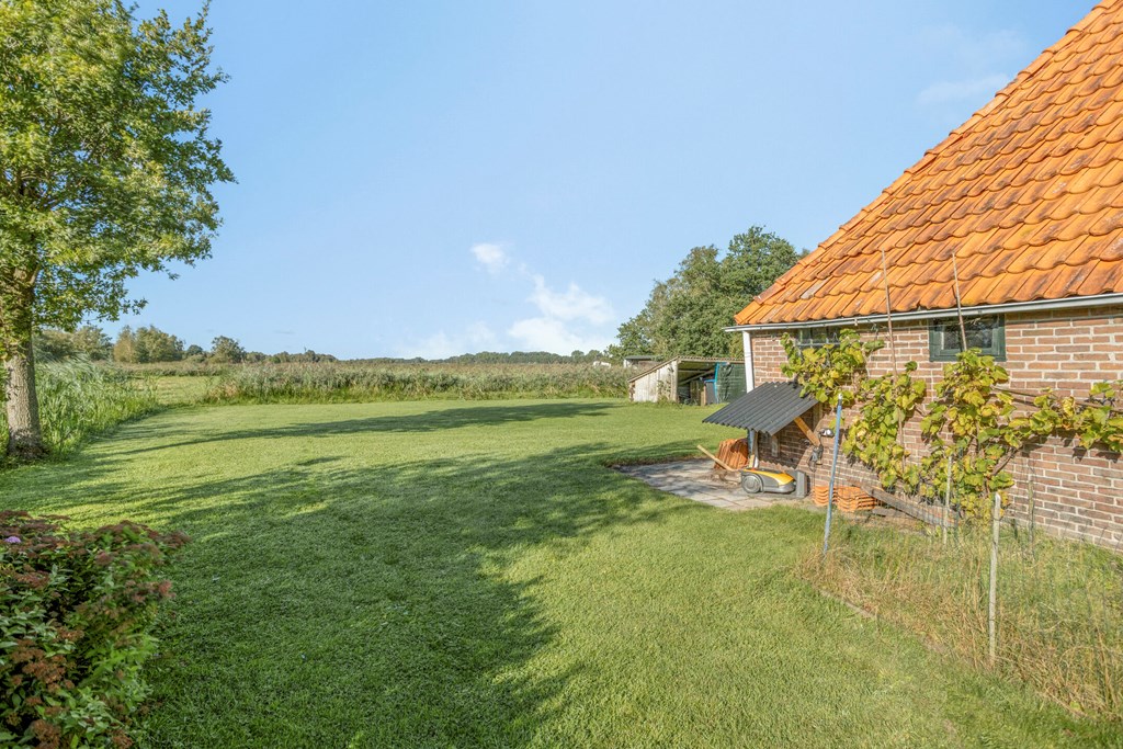 De tuin, gelegen rondom de woonboerderij, is o.a. voorzien van gras, een terras en een aanlegplaats voor een bootje.