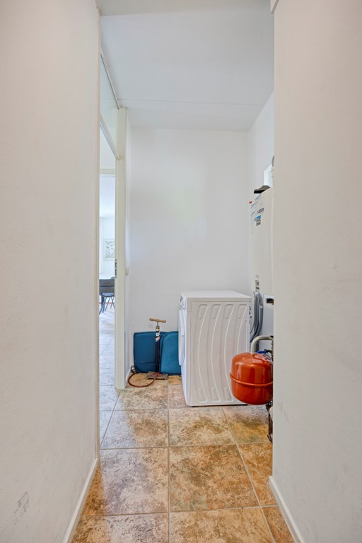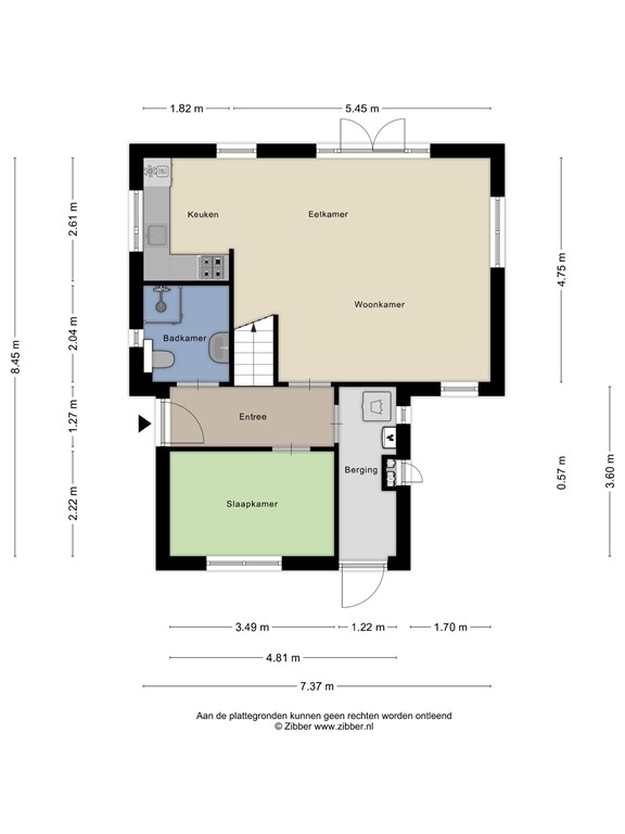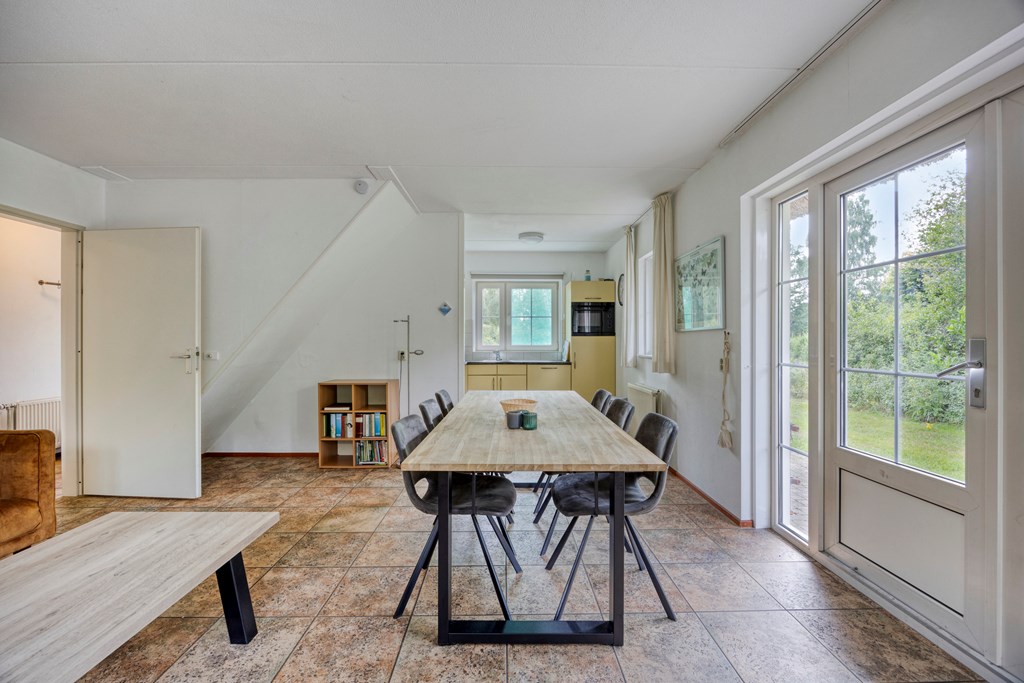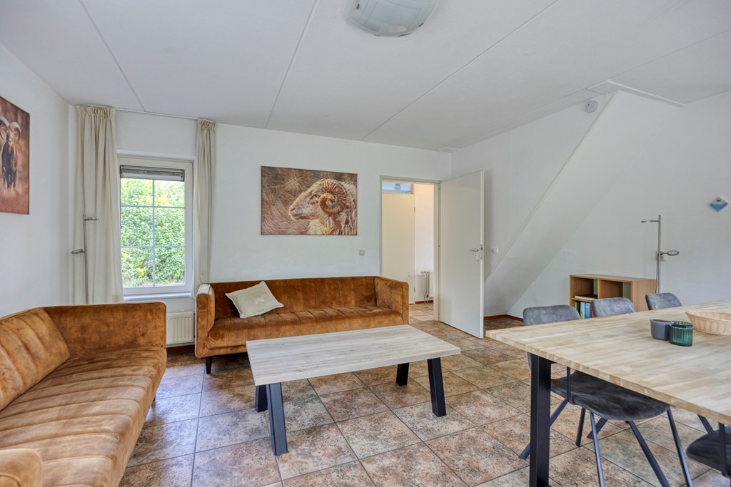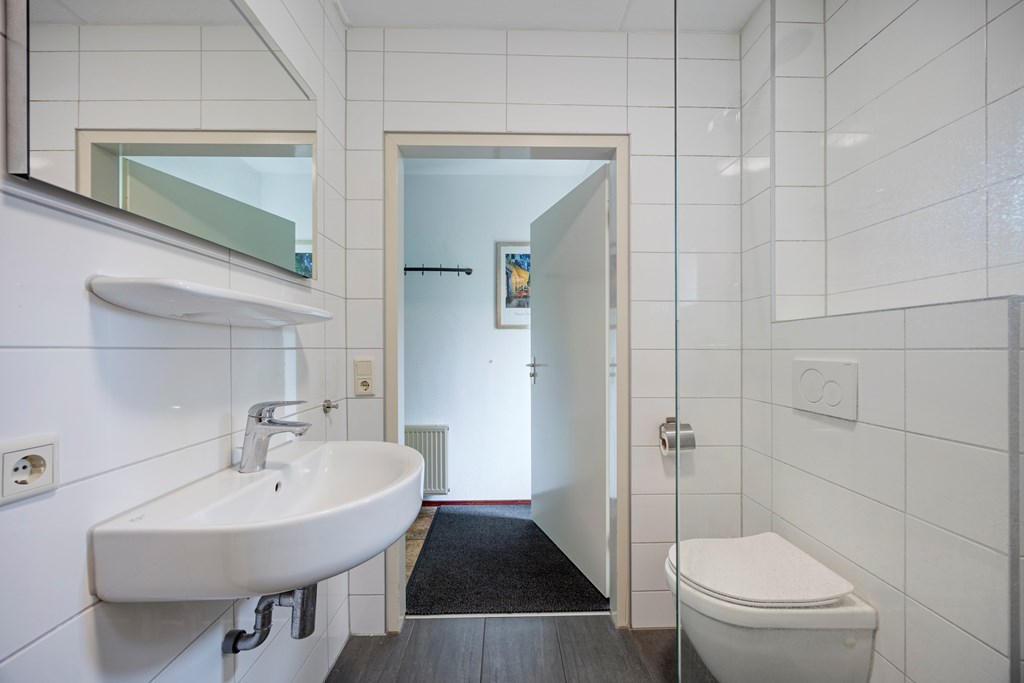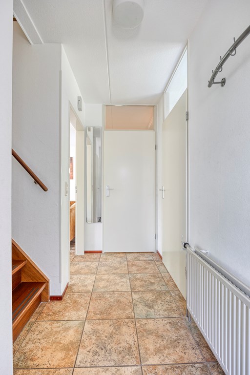 Entree/hal met trapopgang, een slaapkamer en de badkamer voorzien van een toilet, wastafel en een douchehoek. De ruime lichte woonkamer beschikt over openslaande tuindeuren en een L-vormig keukenblok met diverse inbouwapparatuur, o.a. een gaskookplaat, afzuigkap, combimagnetron, vaatwasmachine en een koelkast. Via de hal bereikt u ook de berging/bijkeuken voorzien van een deur naar de tuin. Aan de buitenzijde bevindt zich de meterkast.