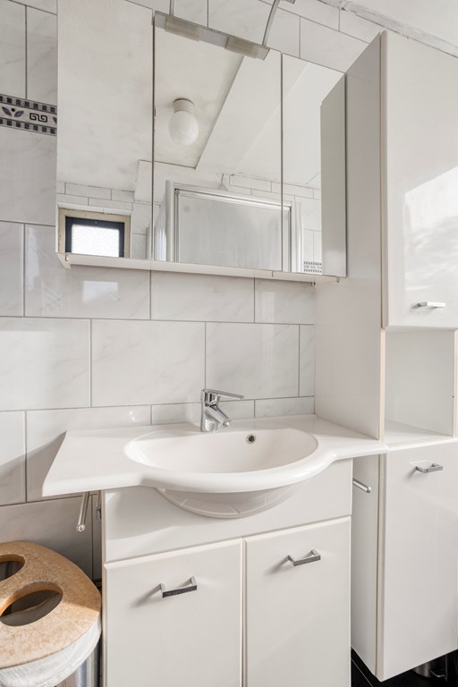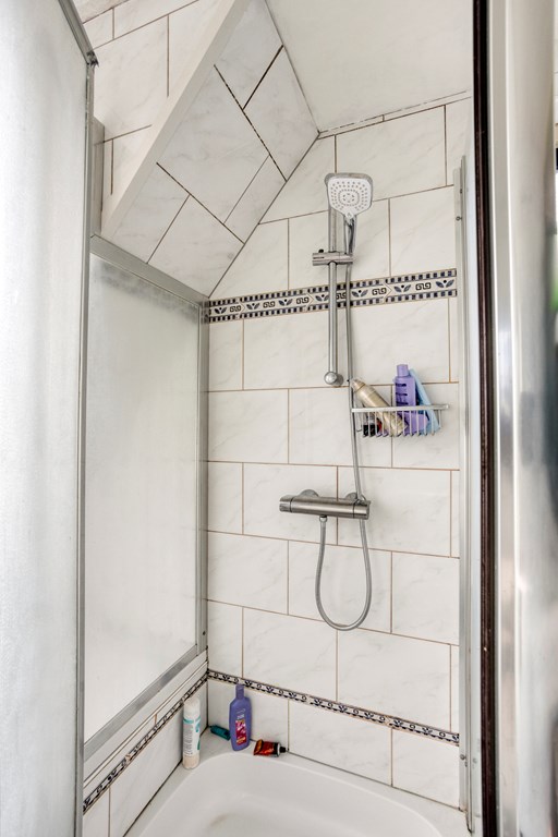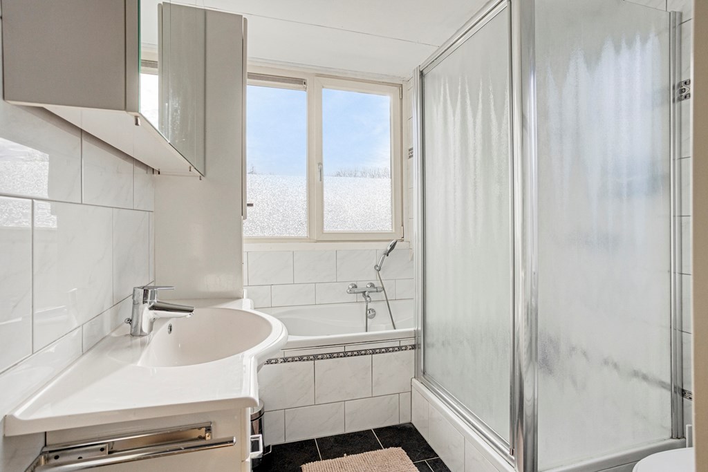 Overloop met trapopgang, 3 slaapkamers en de badkamer voorzien van een ligbad, douchehoek, toilet en wastafel in meubel.
