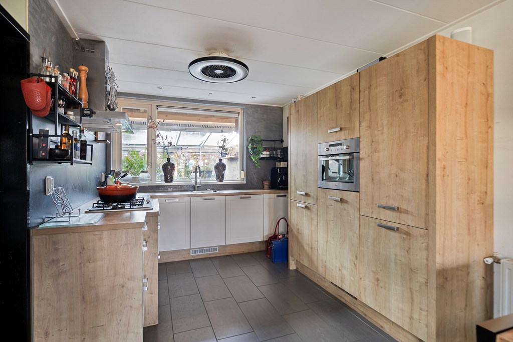 Overdekte entree/ hal met meterkast, toilet en trapopgang. De woonkamer aan de voorzijde beschikt over veel lichtinval, een houtkachel (ter overname) en aan de achterzijde de keukenopstelling met diverse inbouwapparatuur, o.a. gaskookplaat, afzuigkap, combimagnetron, vaatwasmachine en een koelkast. De serre bereikt u via de bijkeuken en is voorzien van een toegang naar de tuin en de garage.
