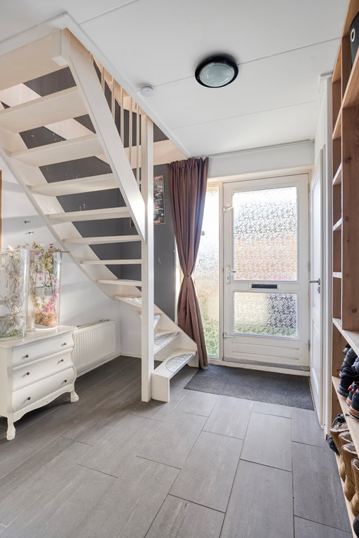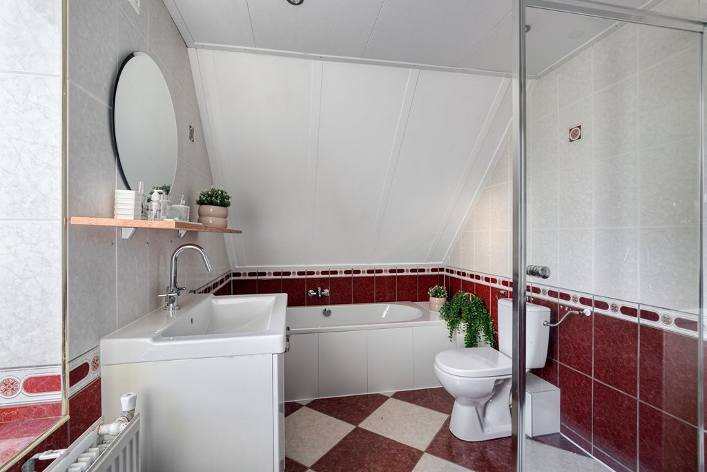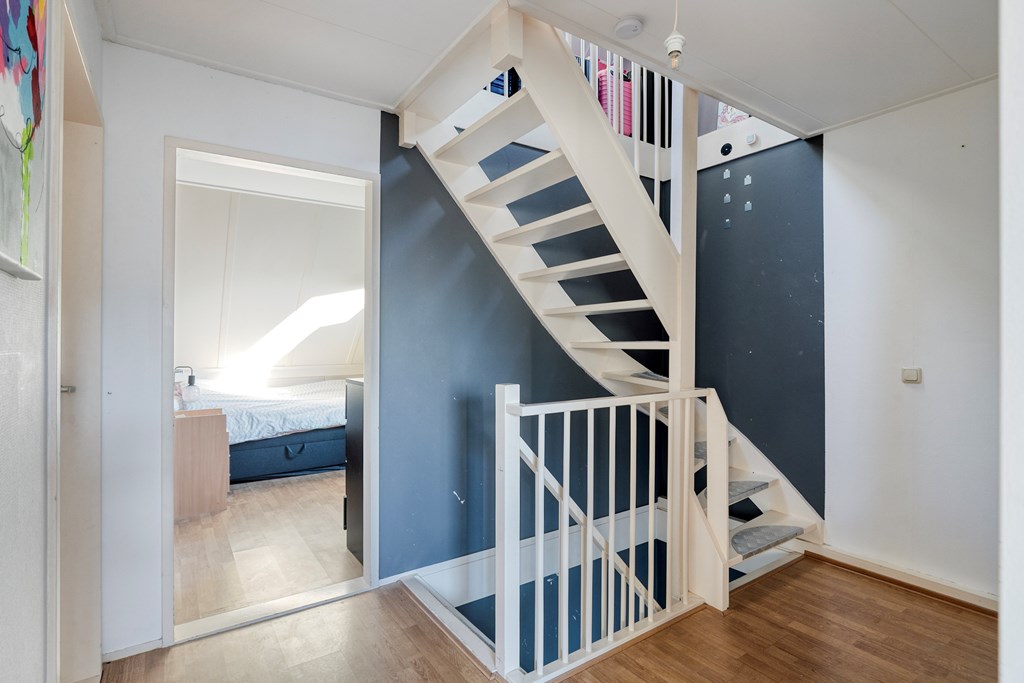 Overloop met trapopgang, berging en 2 slaapkamers, de voorste slaapkamer is eenvoudig te splitsen. De badkamer beschikt over een ligbad, douchehoek, toilet en een wastafel in meubel.