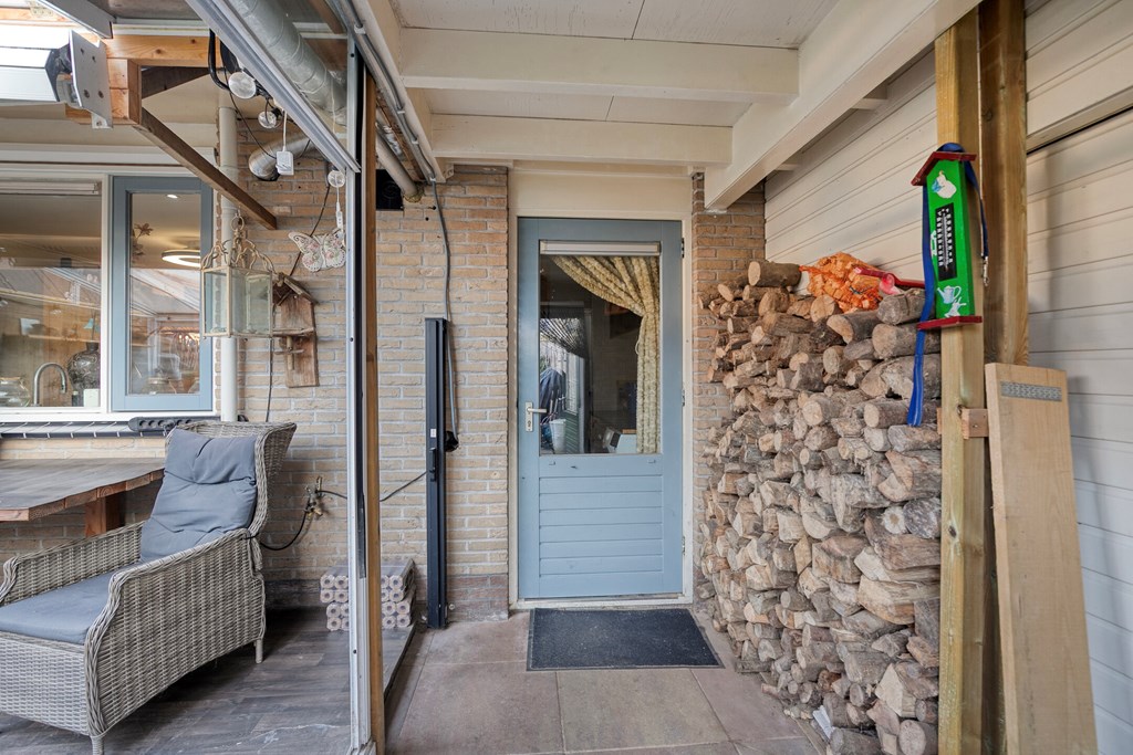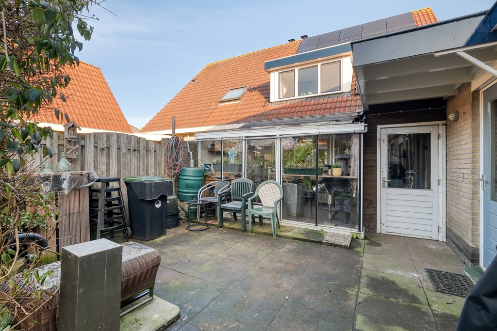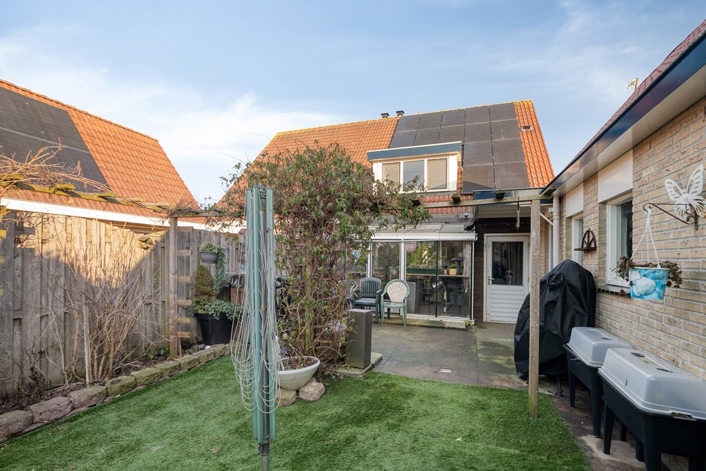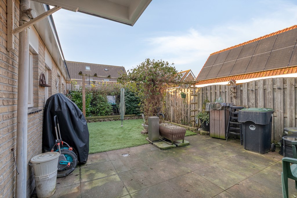 De onderhoudsvriendelijke beschutte achtertuin is gelegen op het westen en beschikt over een ruime berging, nu in gebruik als mancave, met vliering. Voor de garage is een oprit met parkeergelegenheid.