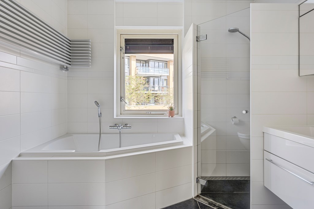 Overloop met trapopgang, 3 slaapkamer en de badkamer voorzien van een bad, douchehoek, toilet en een dubbele wastafel in meubel.