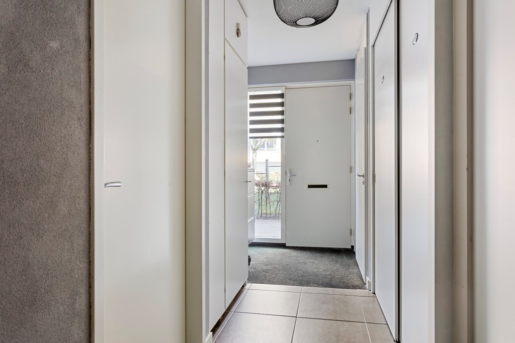 Overdekte entree / hal met meterkast, toilet, trapkast en de trapopgang. De woonkamer beschikt over veel lichtinval en een schuifpui naar de achtertuin, aan de voorzijde met uitzicht op het grasveld, is de keukenopstelling voorzien van diverse inbouwapparatuur, o.a. gaskookplaat, afzuigkap, combimagnetron, vaatwasser, koelkast en een vrieskast.