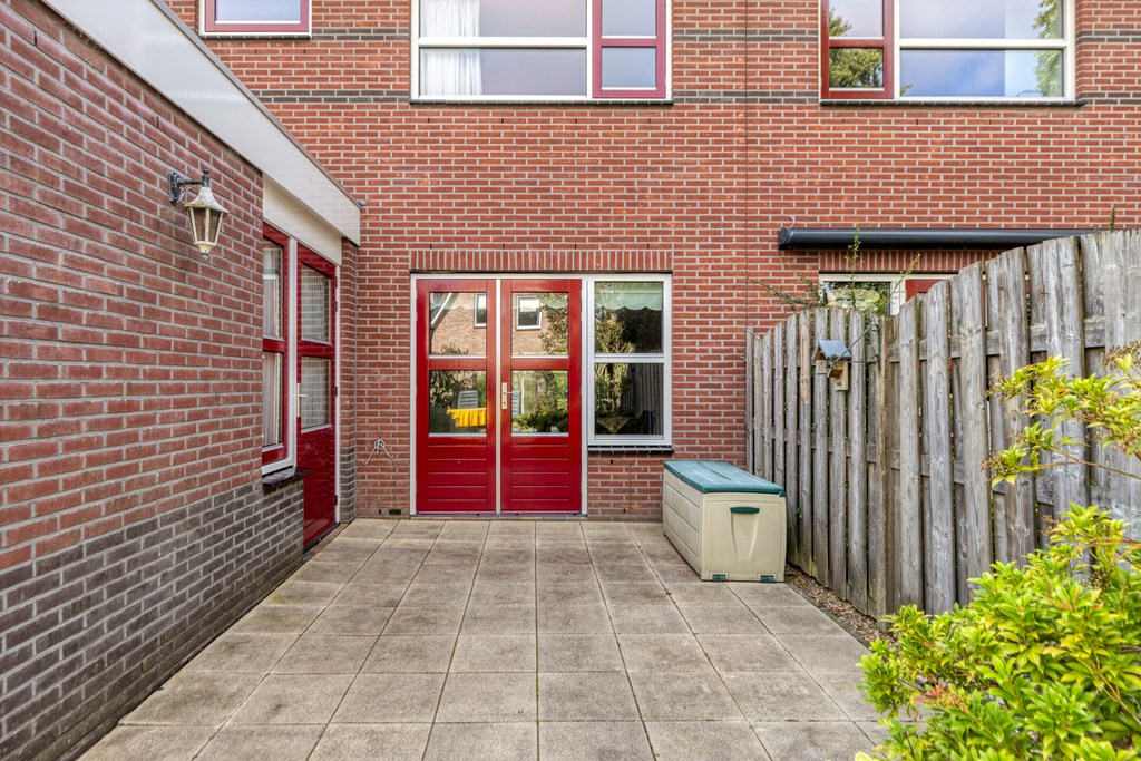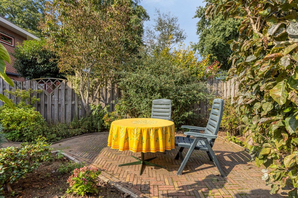 De besloten achtertuin, gelegen op het noordoosten, is voorzien van o.a. diverse terrassen, een houten berging en een achterom. Aan de voorzijde is er parkeerruimte.