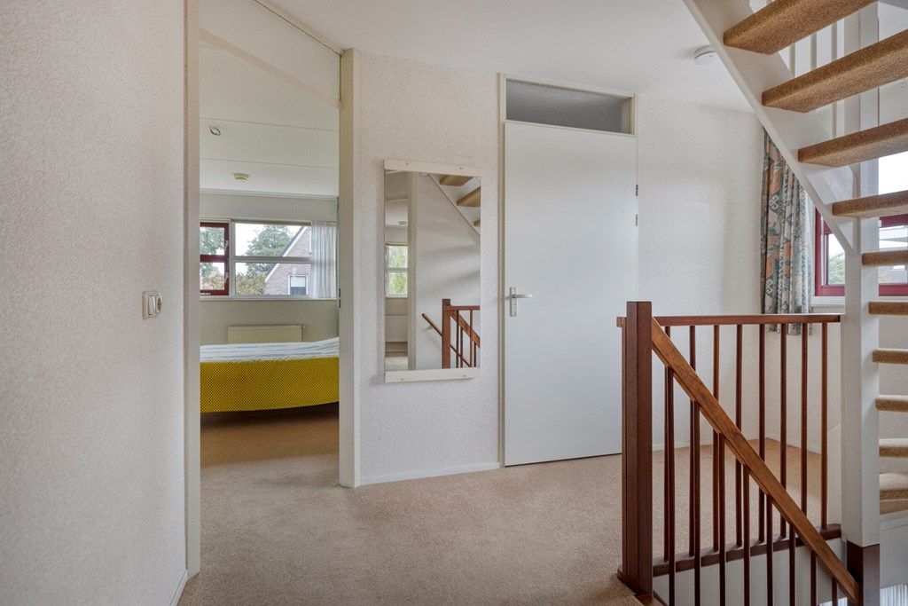 Overloop met trapopgang, 3 slaapkamers en de tweede badkamer voorzien van een bad, douchehoek, wastafel en een toilet.