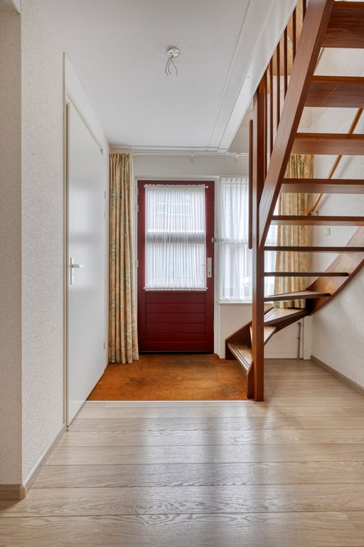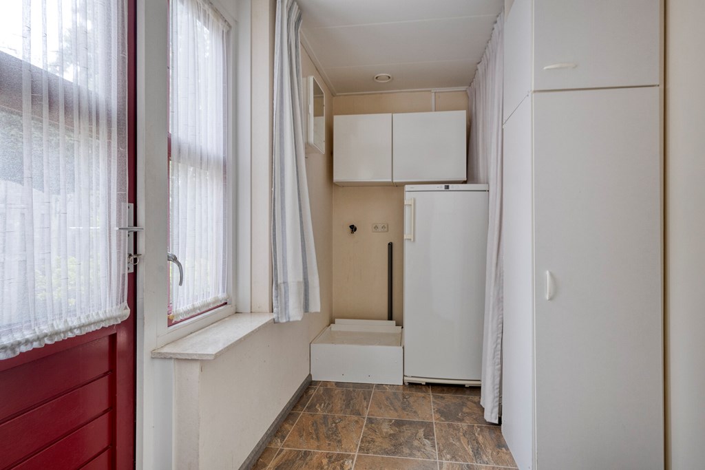 Entree / hal met meterkast, toilet en trapopgang. De woonkamer is voorzien van veel daglicht, openslaande terrasdeuren en de keukenopstelling met diverse inbouwapparatuur, o.a. een gaskookplaat, afzuigkap, oven en koelkast. Via de bijkeuken bereikt u de achtertuin en de slaapkamer. De slaapkamer, voormalige garage, beschikt over 2 buitendeuren, kast en een eigen badkamer met een douche, wastafel en een toilet.