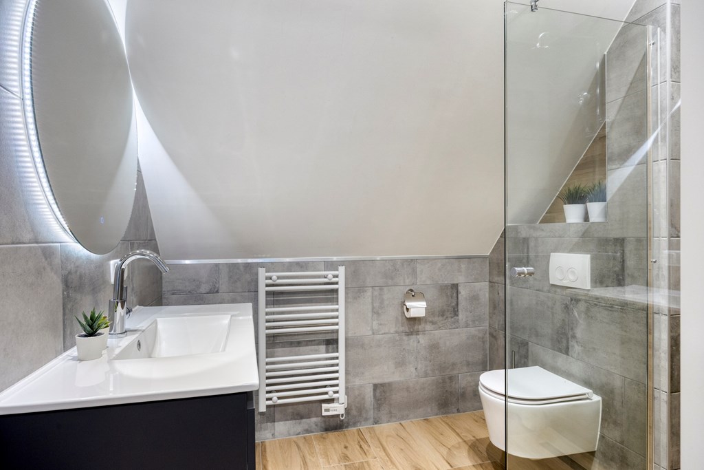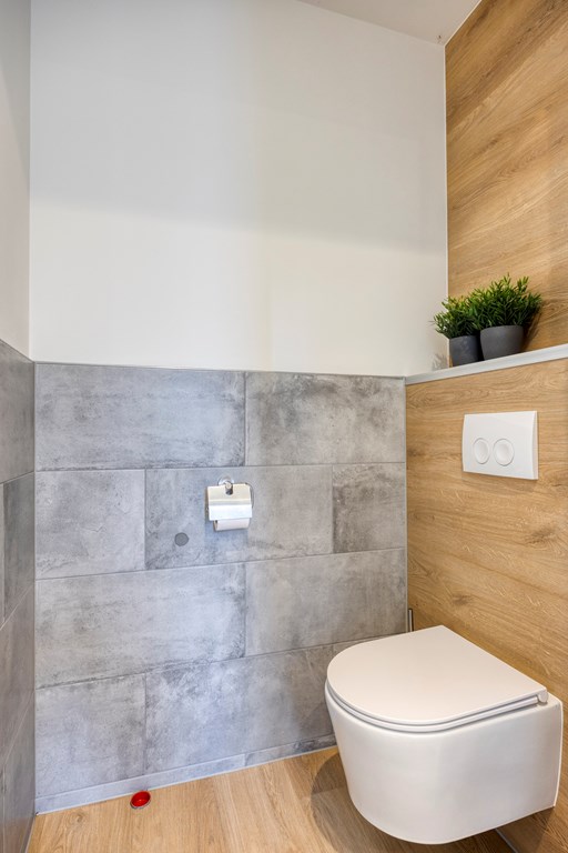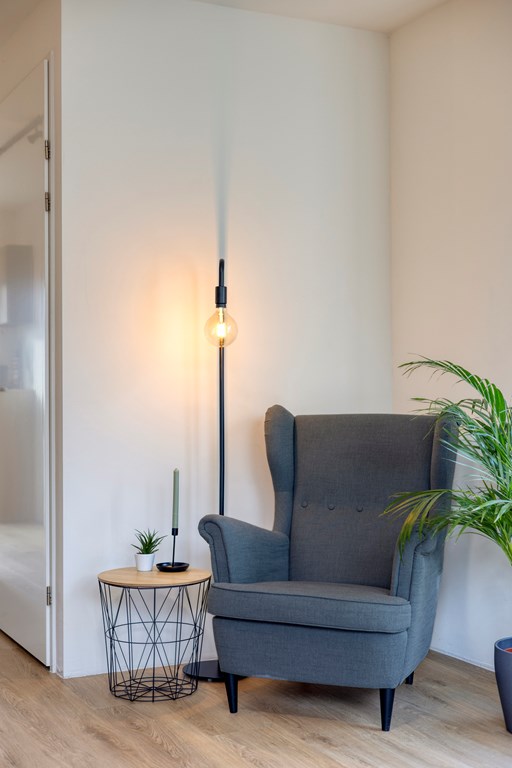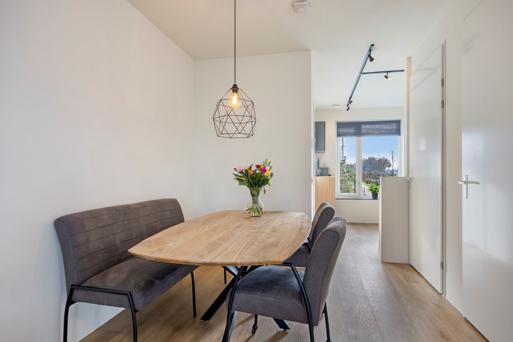- De woning beschikt over een badkamer met douche, toilet en wastafel in meubel;