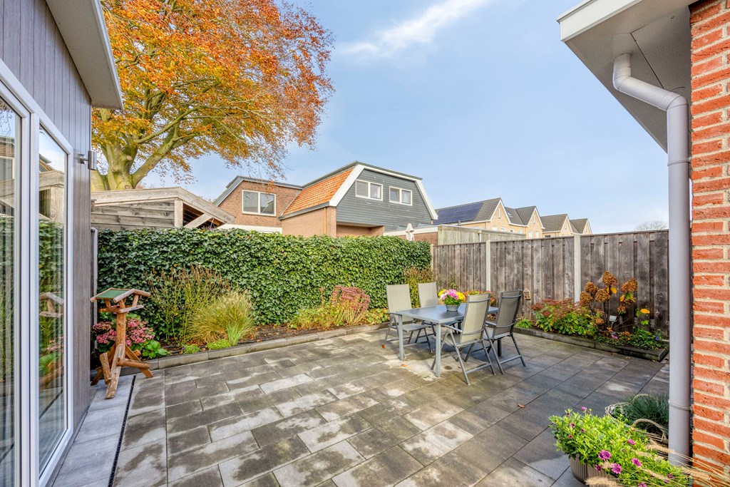 De onderhoudsvriendelijke tuin beschikt over een terras, een grasveld, een houten overkapping, parkeergelegenheid en een tuinhuis met een eigen badkamer. Het geïsoleerde tuinhuis is geschikt voor diverse doeleinden, o.a. gastenverblijf, praktijkruimte of werkstudio.