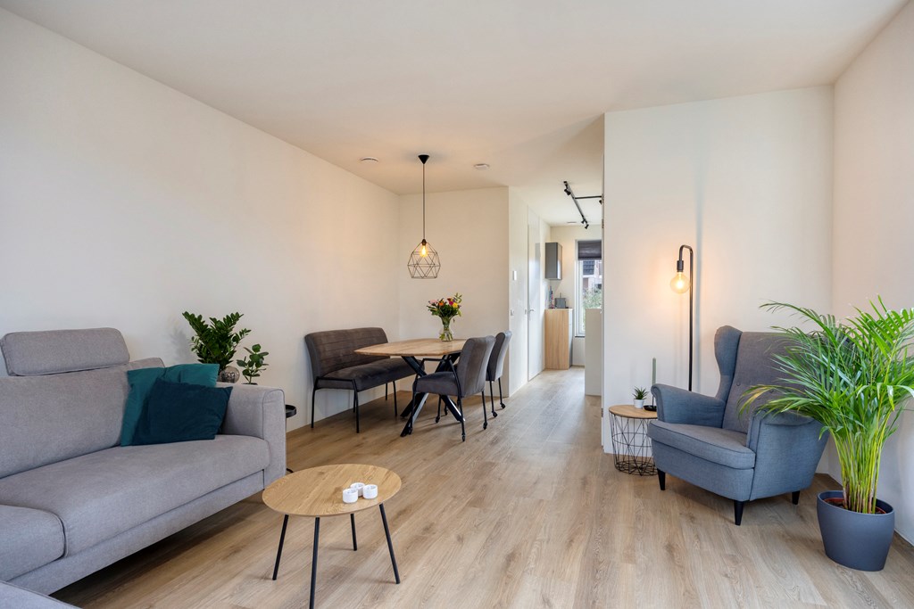 Entree/hal met meterkast en toilet. De ruime woonkamer is voorzien van veel lichtinval, schuifpui, trapkast, trapopgang en aan de voorzijde de keukenopstelling met diverse inbouwapparatuur, o.a. een inductiekookplaat, afzuigkap, oven, koelkast en een vaatwasmachine.