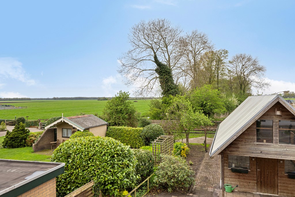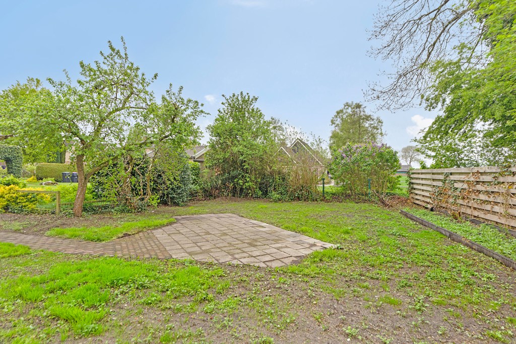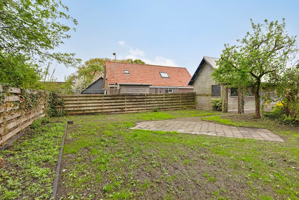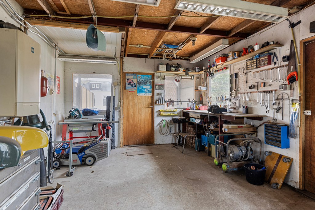De diepe achtertuin, gelegen op het noordwesten, is voorzien van een terras, veel privacy, parkeergelegenheid en een grote schuur met een zolder, bereikbaar middels een vlizotrap.