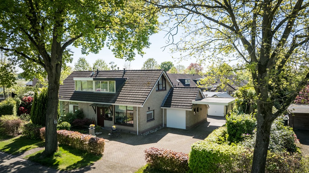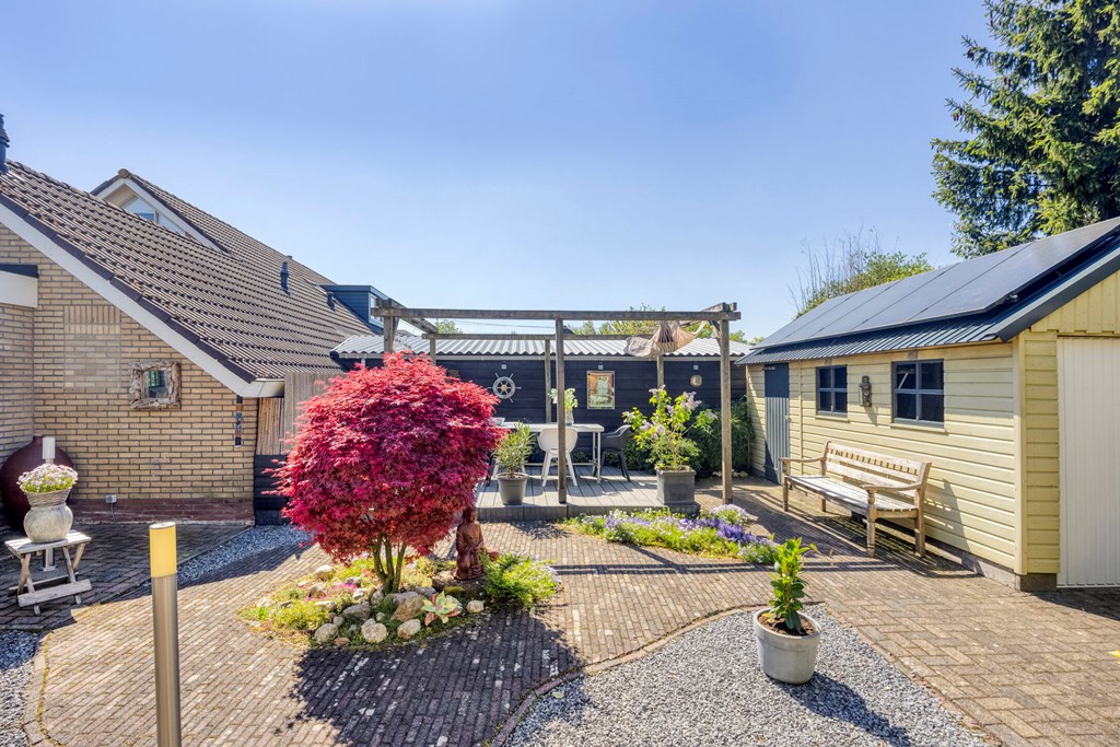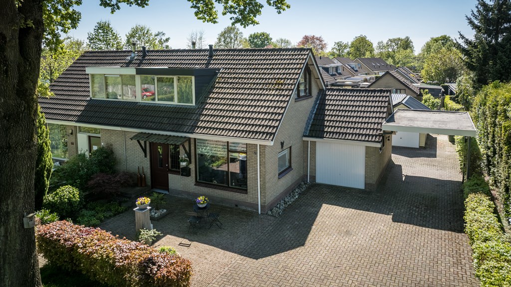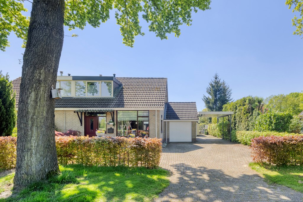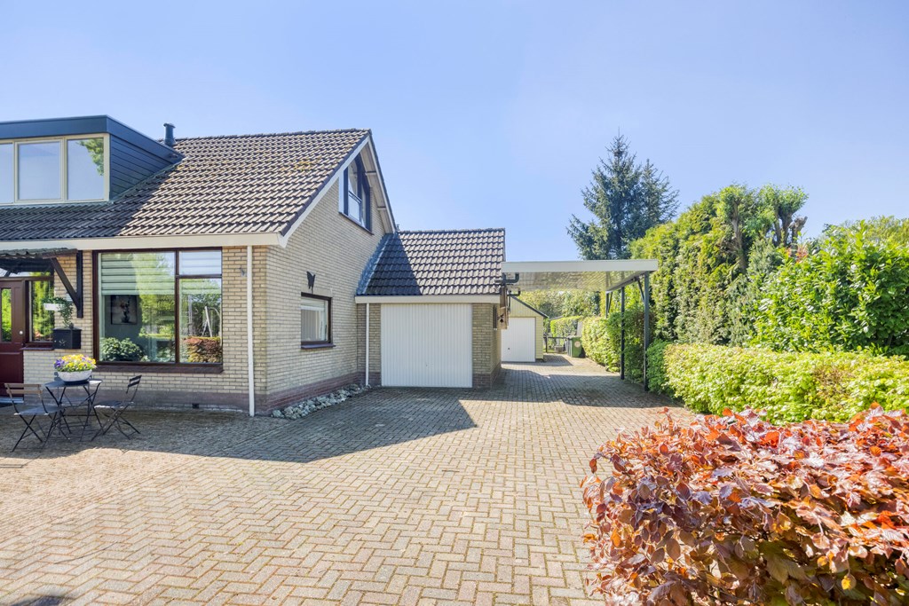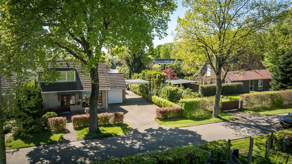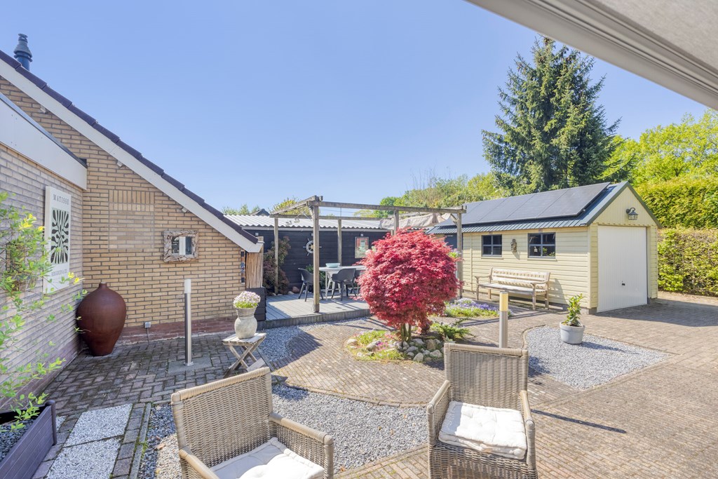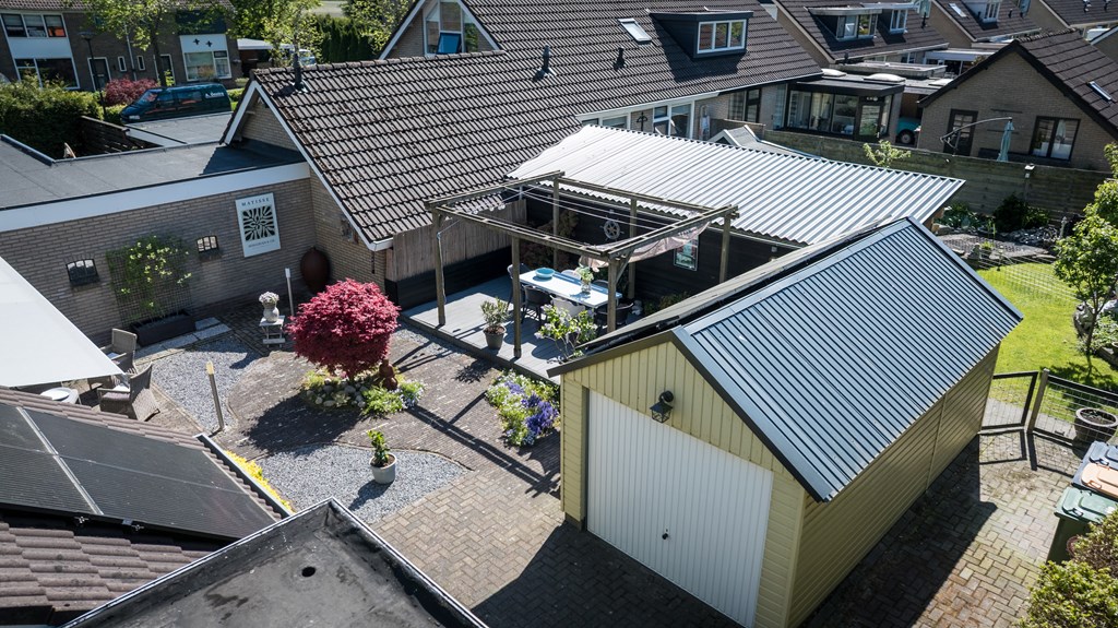De beschutte achtertuin, gelegen op het zuidwesten, beschikt over diverse terrassen en een houten garage. Naast de woning staat een carport en in de voortuin is een ruime oprit met parkeergelegenheid.