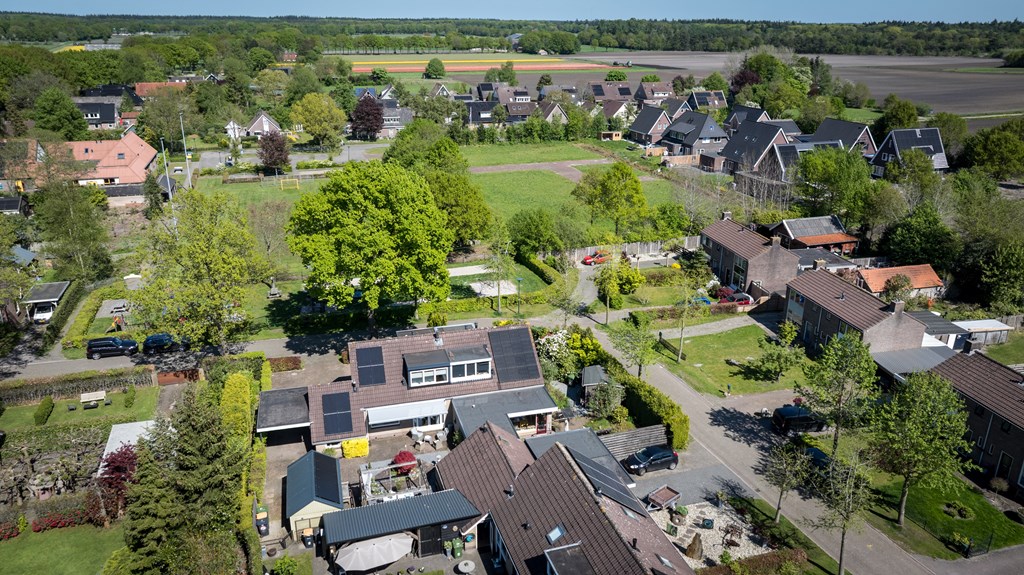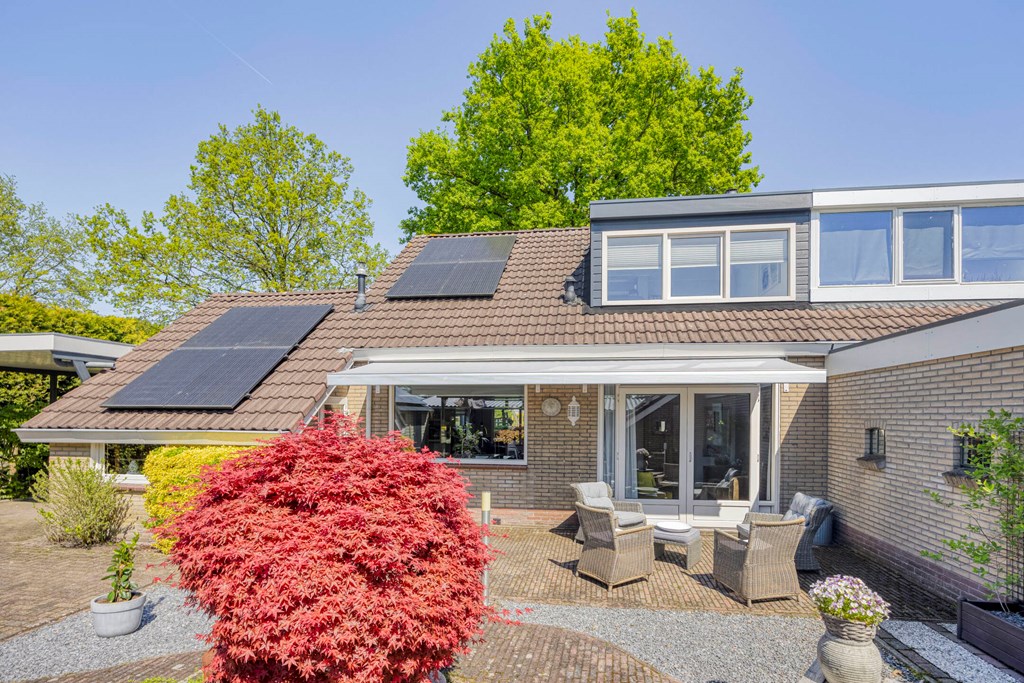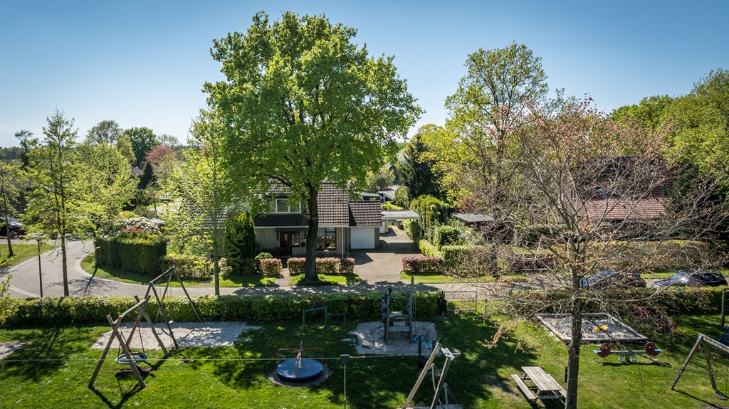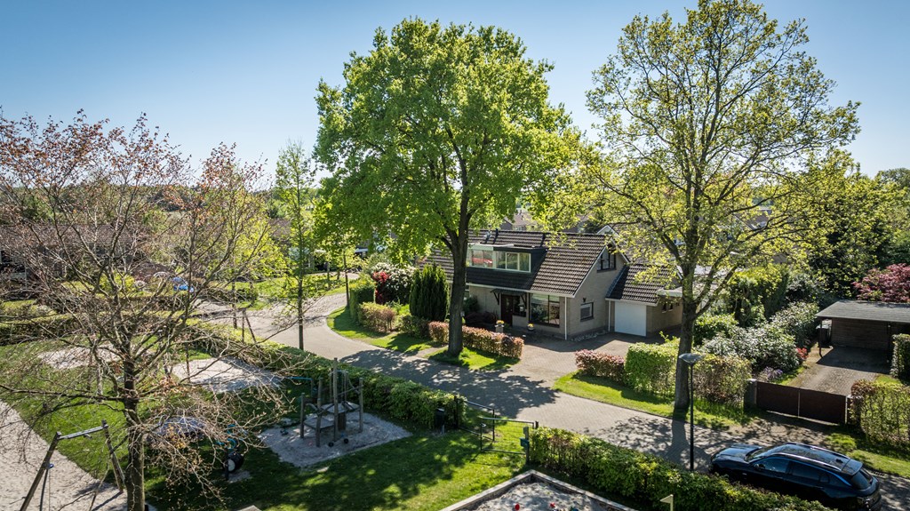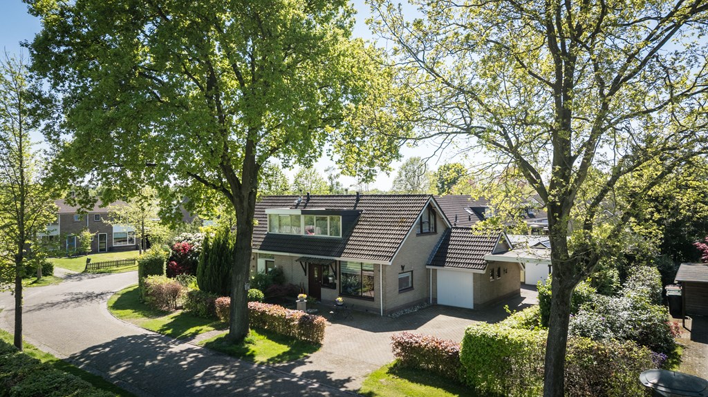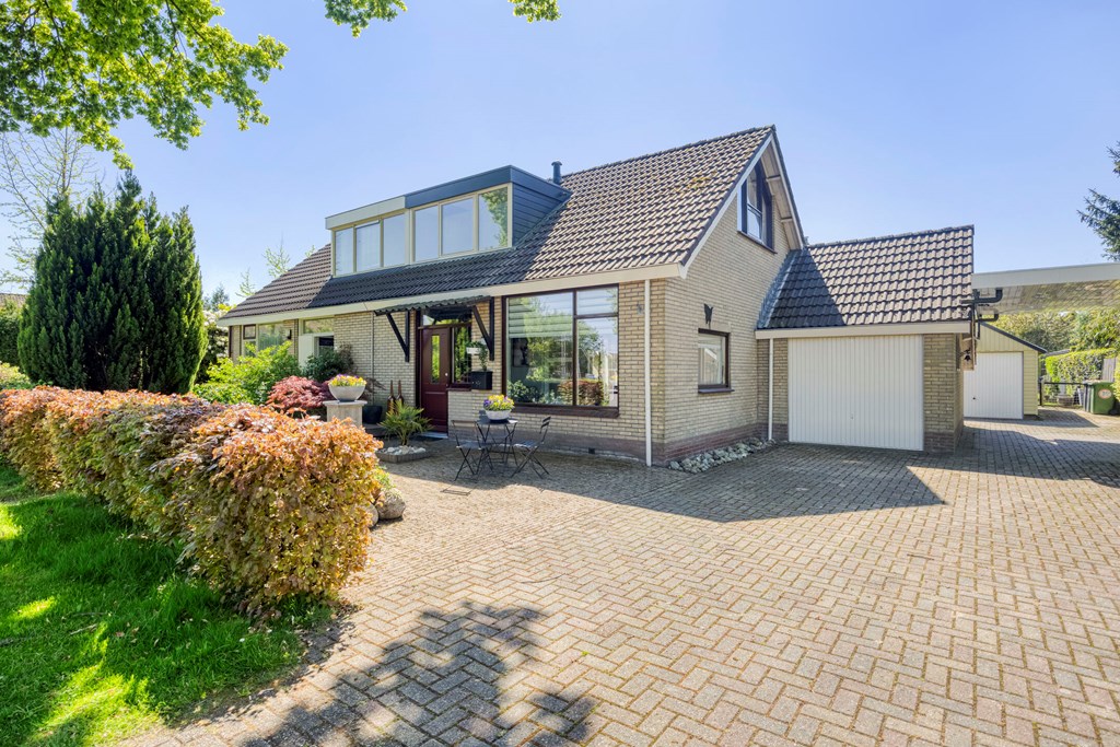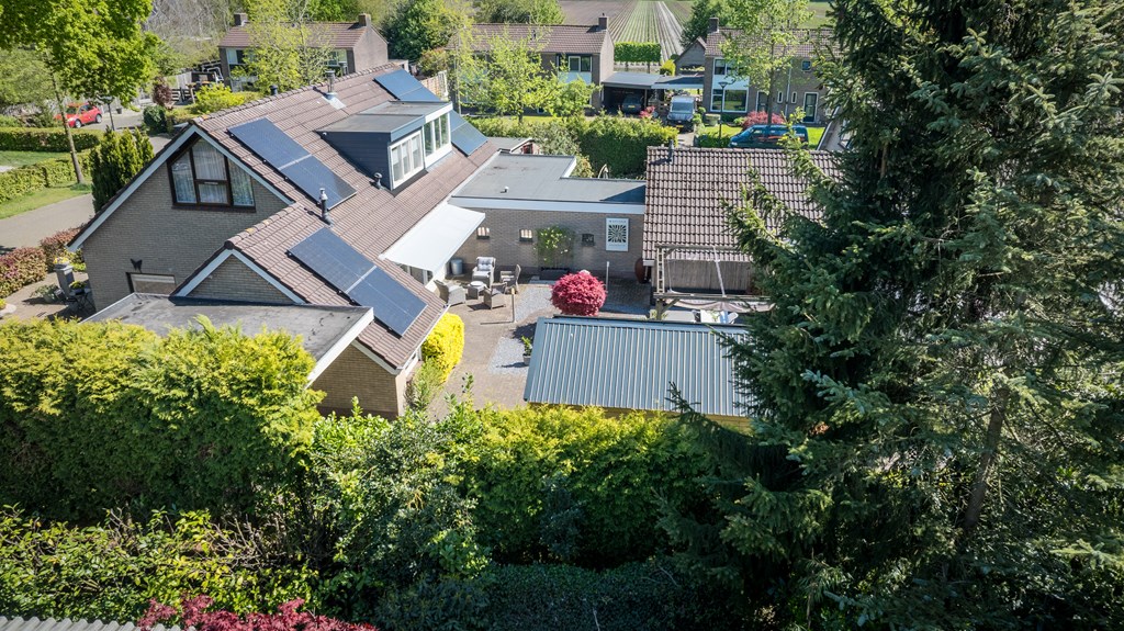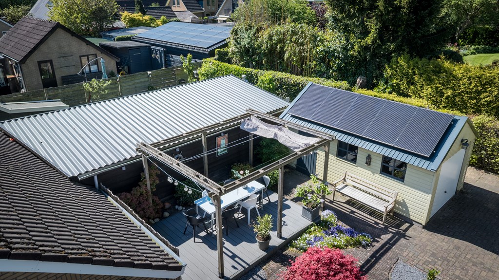 De beschutte achtertuin, gelegen op het zuidwesten, beschikt over diverse terrassen en een houten garage. Naast de woning staat een carport en in de voortuin is een ruime oprit met parkeergelegenheid.