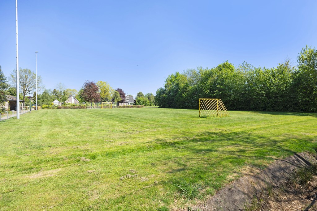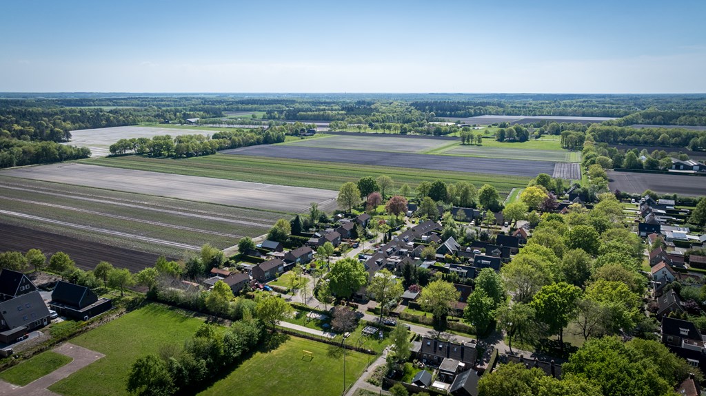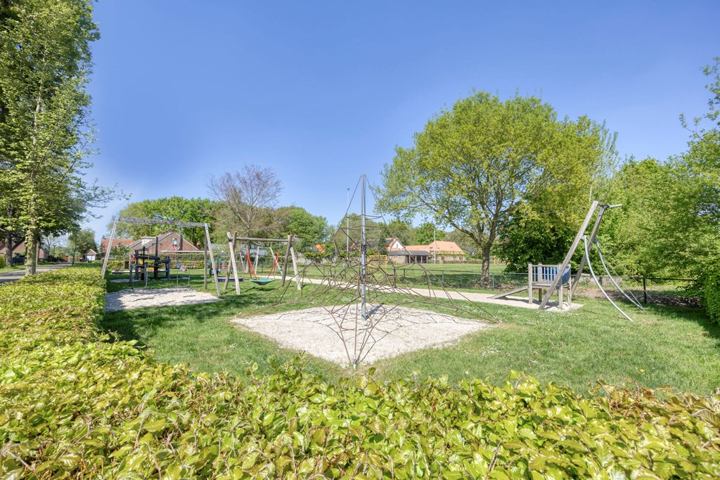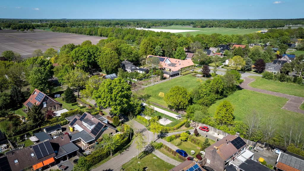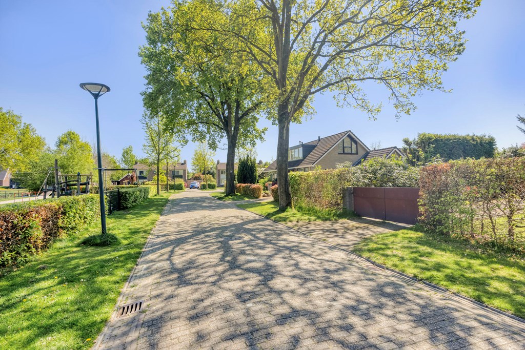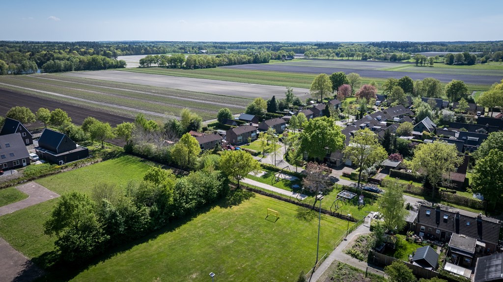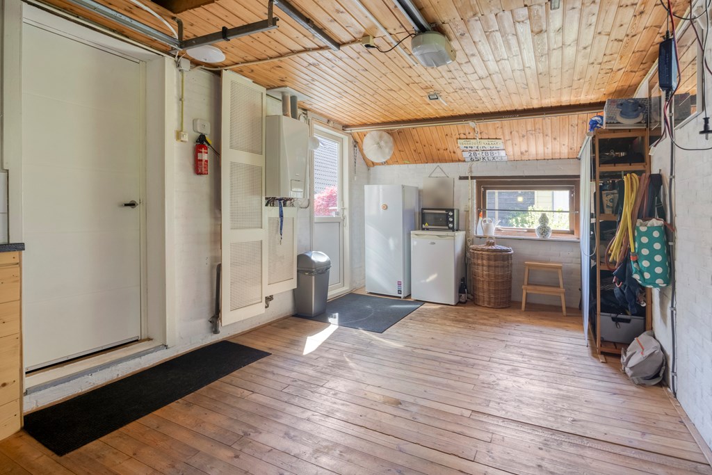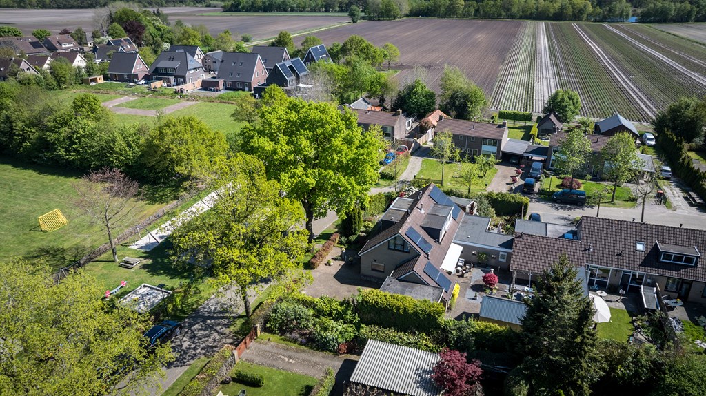 De beschutte achtertuin, gelegen op het zuidwesten, beschikt over diverse terrassen en een houten garage. Naast de woning staat een carport en in de voortuin is een ruime oprit met parkeergelegenheid.