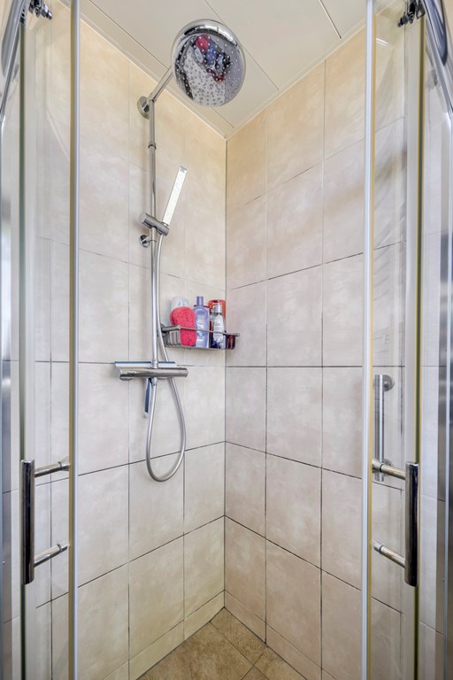Overloop met 2 ruime slaapkamers en een badkamer voorzien van een toilet, douchehoek en een wastafel in meubel.
