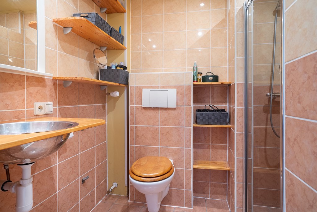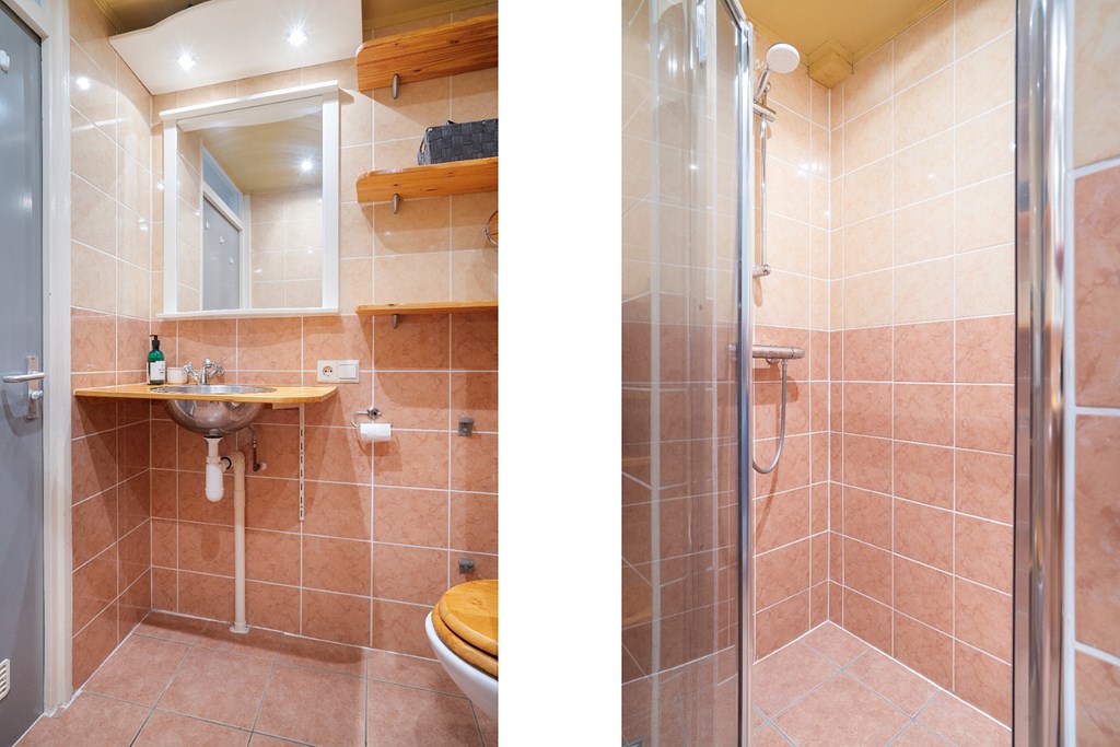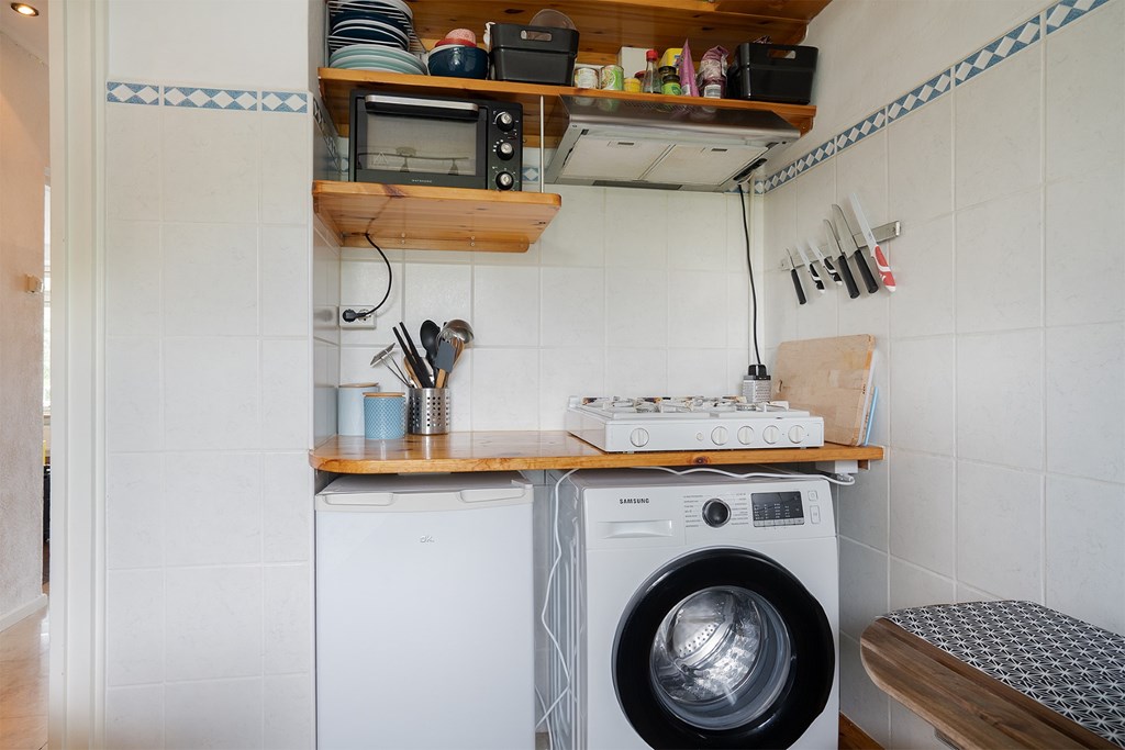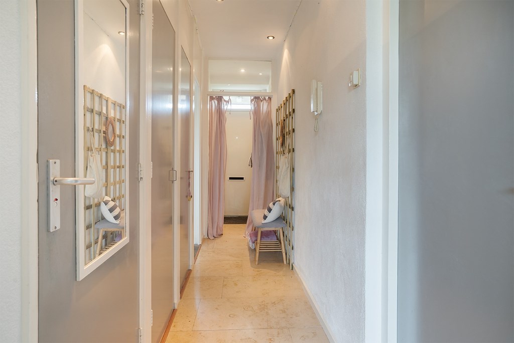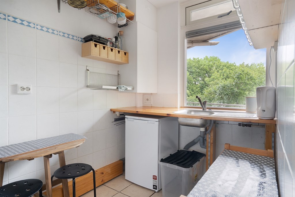 Appartement: entree / gang met intercom, meterkast en kast. De woonkamer met uitzicht richting de Rijn is voorzien van veel lichtinval. De keuken, aan de voorzijde is voorzien van een gaskookplaat, afzuigkap en een opstelplaats voor een wasmachine en koelkast. De slaapkamer beschikt over een hang-en legkast en een balkon. De badkamer is voorzien van een wastafel, toilet en een douchehoek.