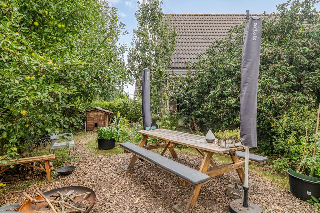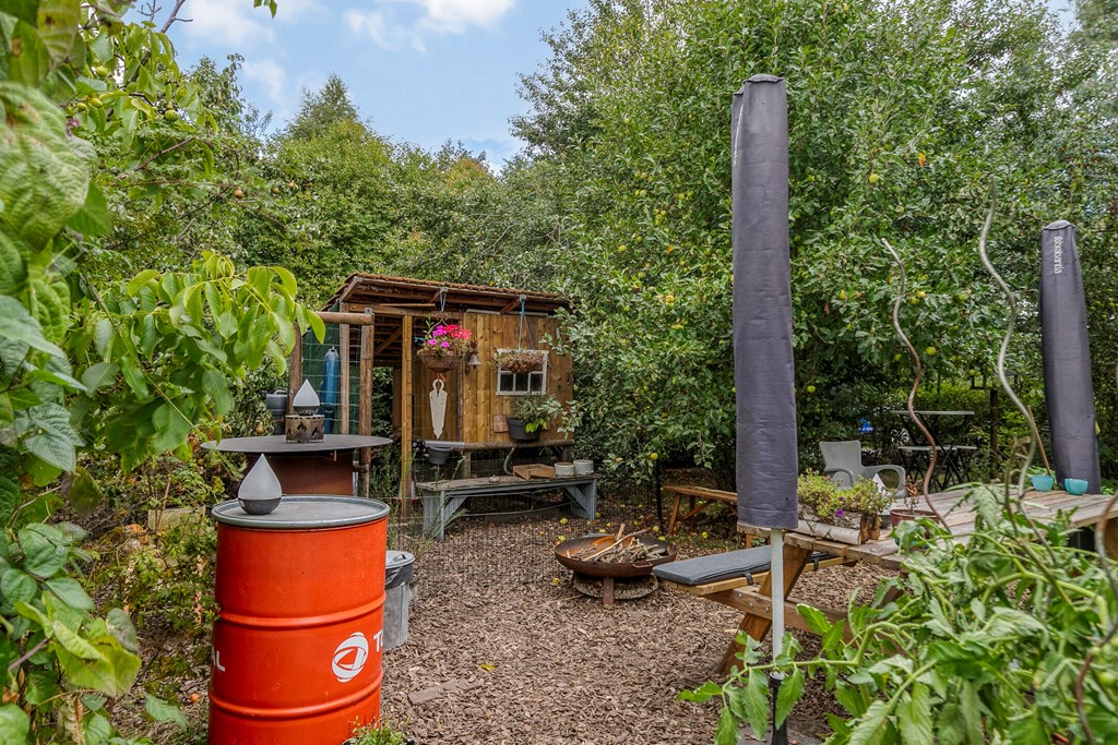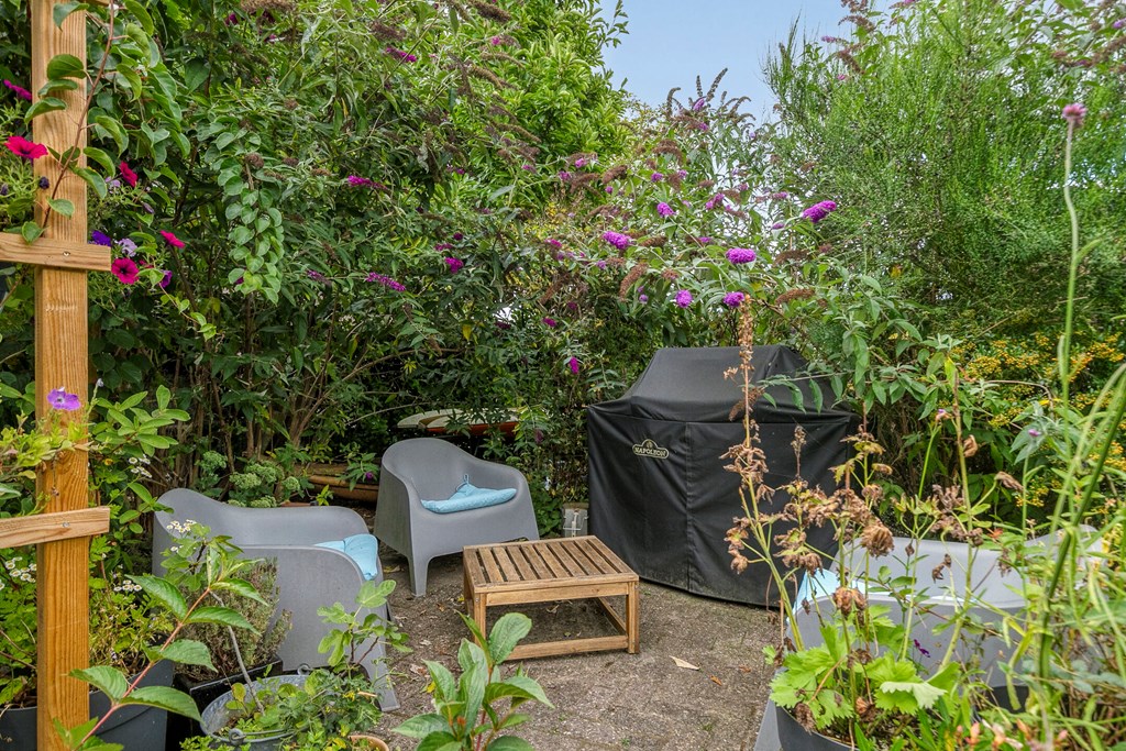 Een tuin voorzien van veel groen, privacy en diverse terrassen. Naast de woning is een garage met een oprit.