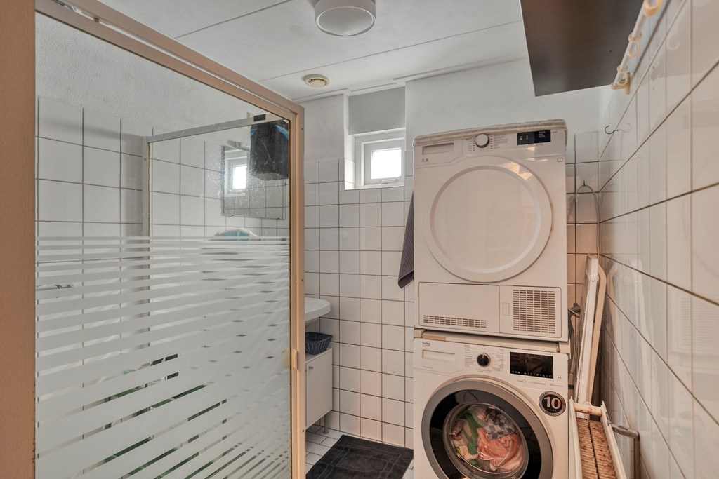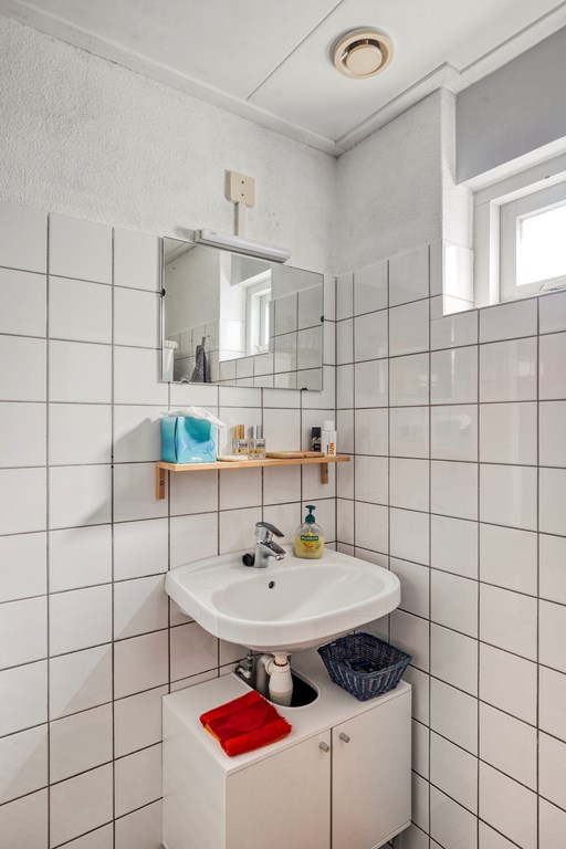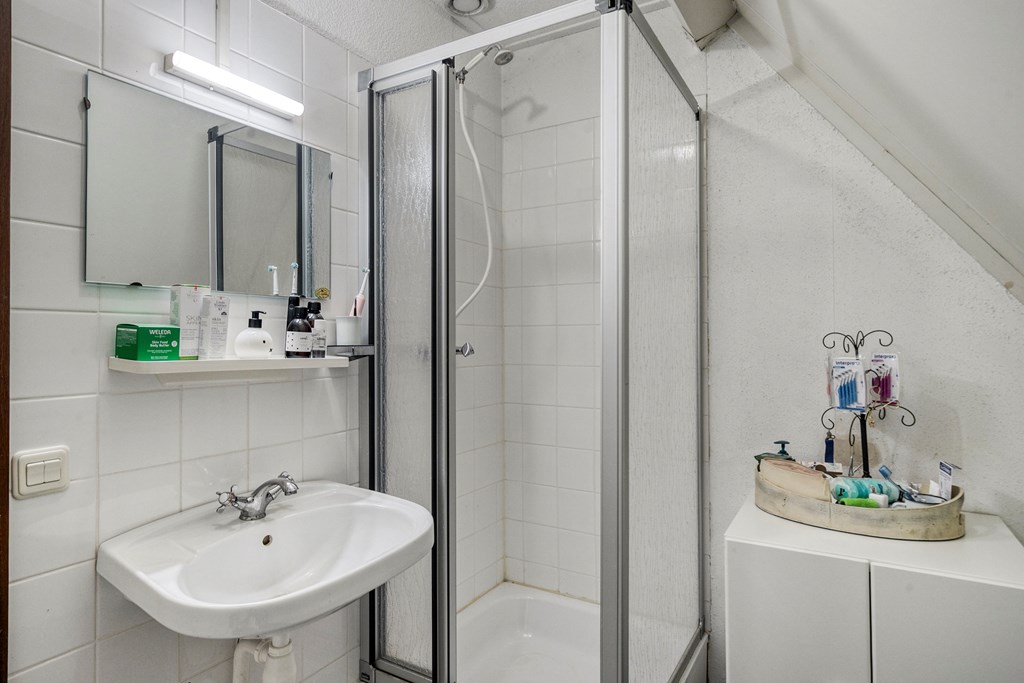 Overloop met berging, 2 ruime slaapkamers en de badkamer voorzien van een douchehoek en een wastafel.
