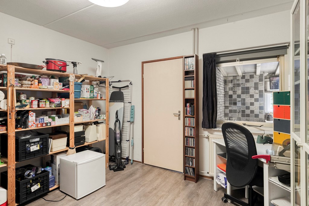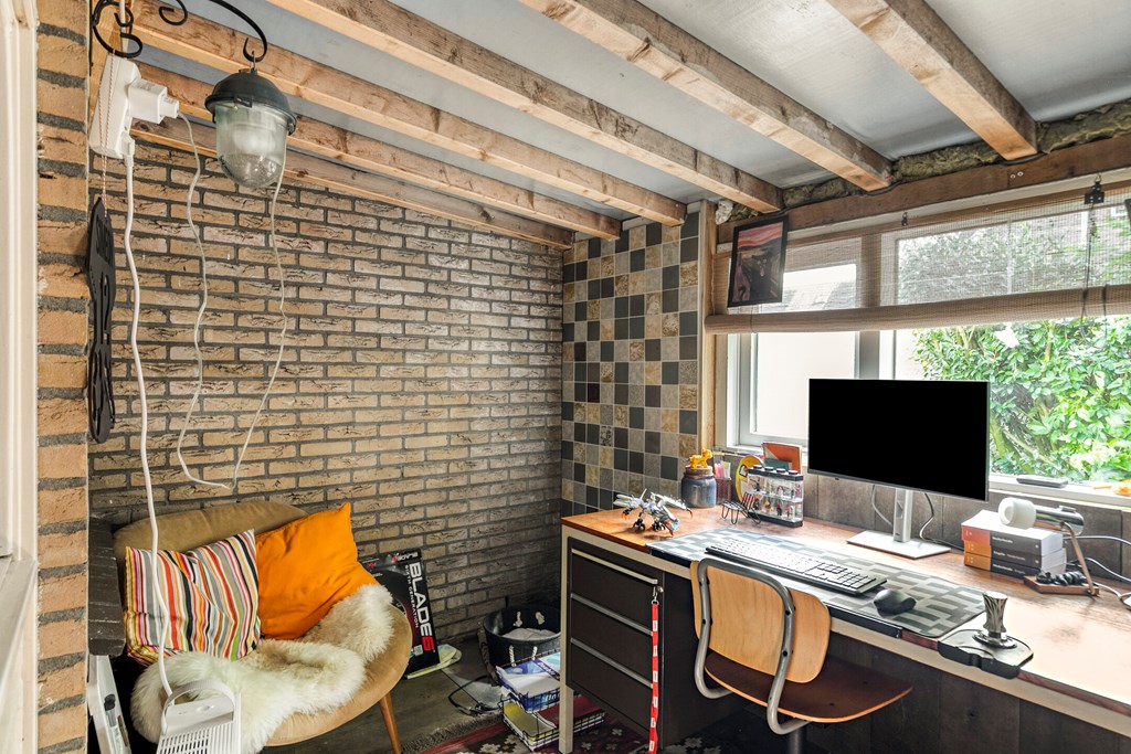 Entree/hal met meterkast, toilet en trapopgang. De woonkamer beschikt over een openslaande tuindeur en een toegang naar de keuken voorzien van een keukenblok met inbouwapparatuur o.a. gaskookplaat, combimagnetron, afzuigkap, vaatwasmachine en een koelkast. Via de keuken bereikt u de studeerkamer. De slaapkamer, bereikbaar via de woonkamer, is voorzien van een badkamer met een douchehoek, wastafel en een aansluiting voor een wasmachine.