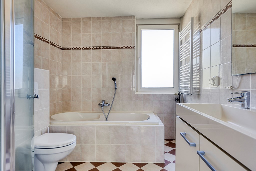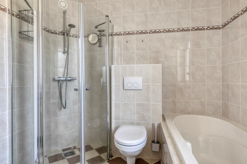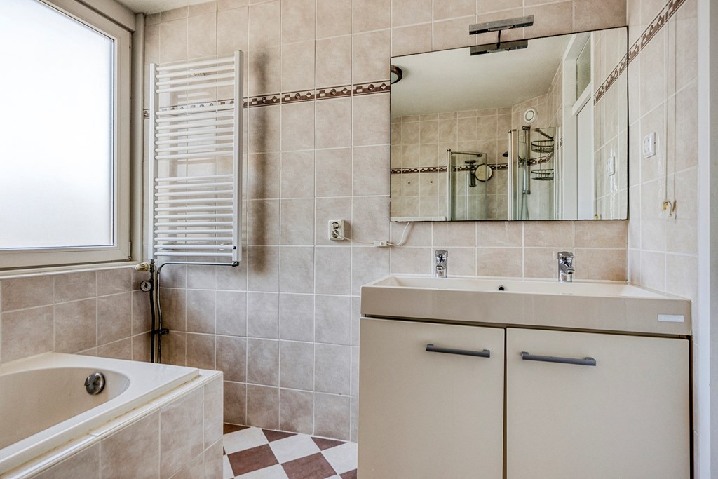 Overloop met trapopgang, 3 slaapkamers en de badkamer voorzien van een douchehoek, ligbad, toilet en een dubbele wastafel in een meubel.