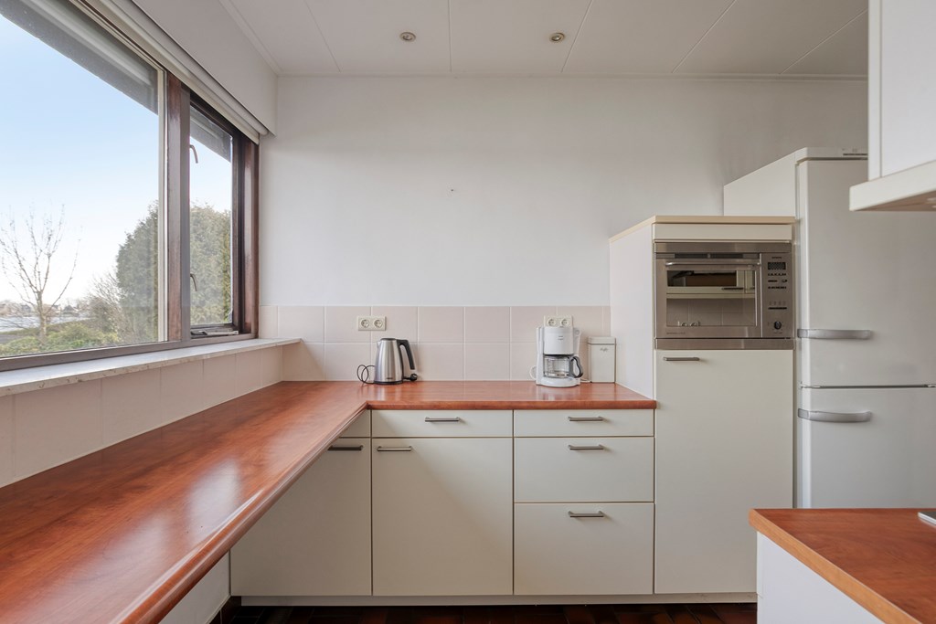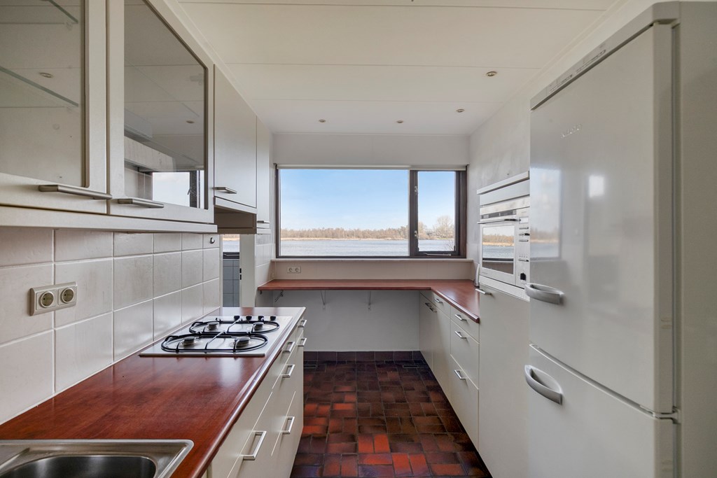 Entree/hal met meterkast, toilet en trapopgang. De woonkamer met uitzicht op het water, beschikt over veel lichtinval, een schuifpui en een open haard. De keuken is voorzien van 2 keukenblokken met diverse inbouwapparatuur o.a. een gaskookplaat, afzuigkap en een vaatwasser. Via de bijkeuken bereikt u de achtertuin en de garage.