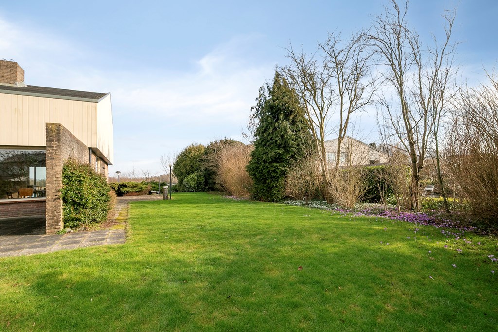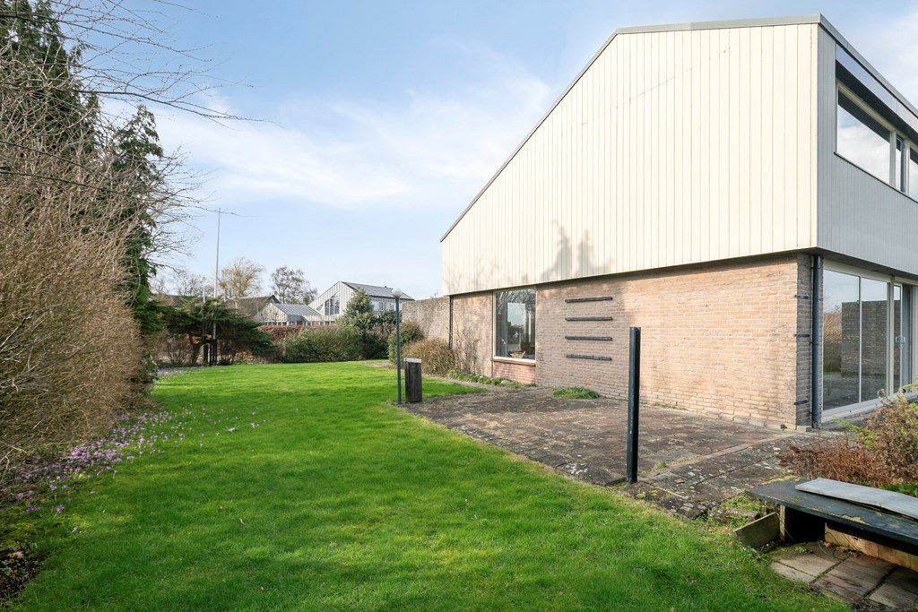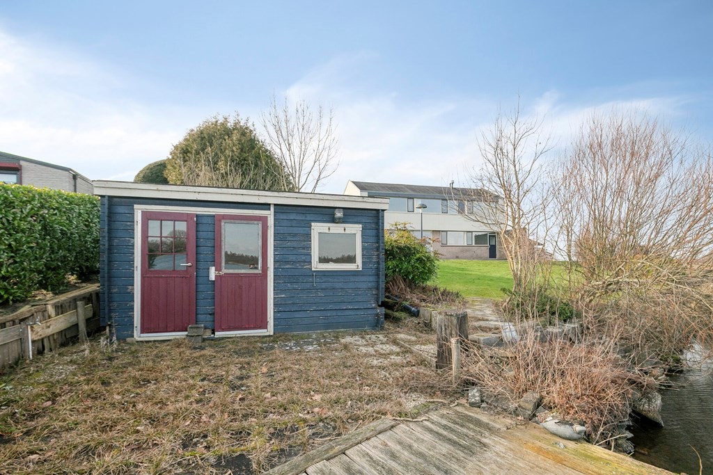 De tuin rondom de woning grenst gedeeltelijk aan vaarwater en beschikt over diverse terrassen, een aanlegsteiger, 2 bergingen en parkeergelegenheid voor meerdere auto’s.